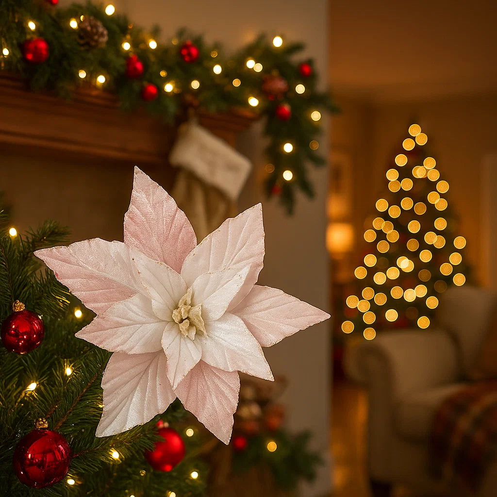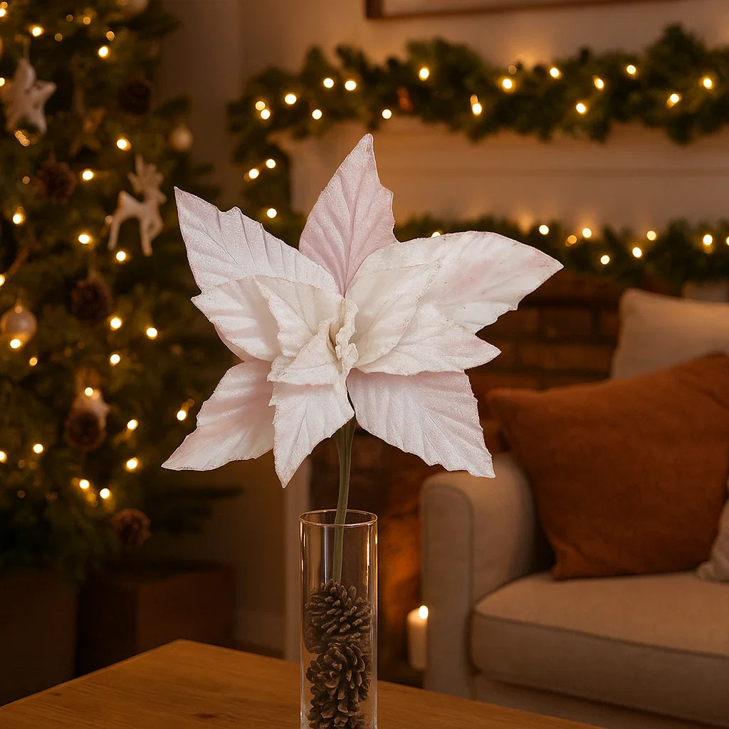 Il colore bianco della stella di Natale è scelto per il suo carattere elegante e versatile, che si integra perfettamente con una vasta gamma di palette natalizie e stili di decorazione.