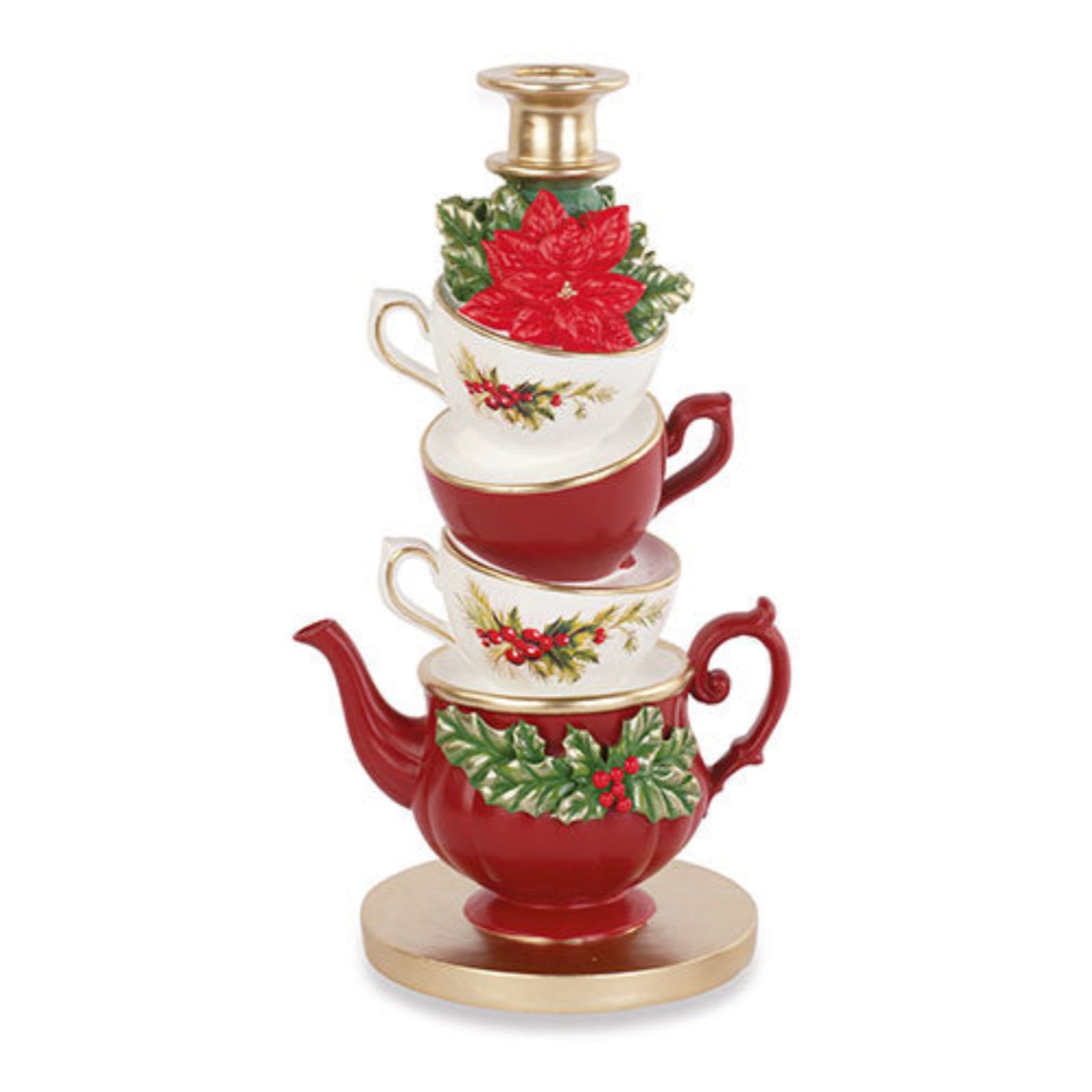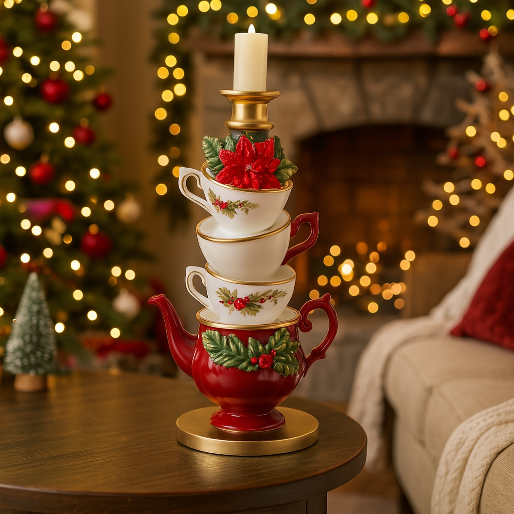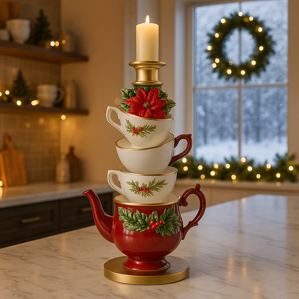 Porta in casa un tocco di allegria e fantasia con questo originale porta candela natalizio a forma di teiere rosse impilate.