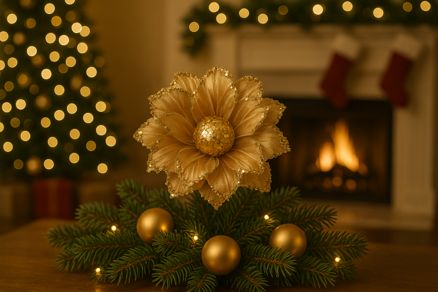 Ramo decorativo natalizio "Fiore Oro" con petali in tessuto da 25 cm