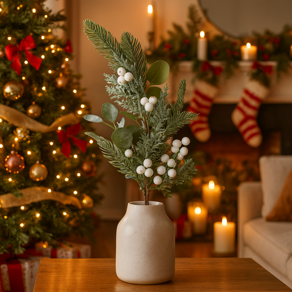 Perfetto per una varietà di applicazioni decorative, questo ramo può essere utilizzato come ornamento per tavoli, caminetti, ingressi o per comporre centrotavola festivi, portando un'atmosfera serena e invernale agli spazi domestici.