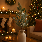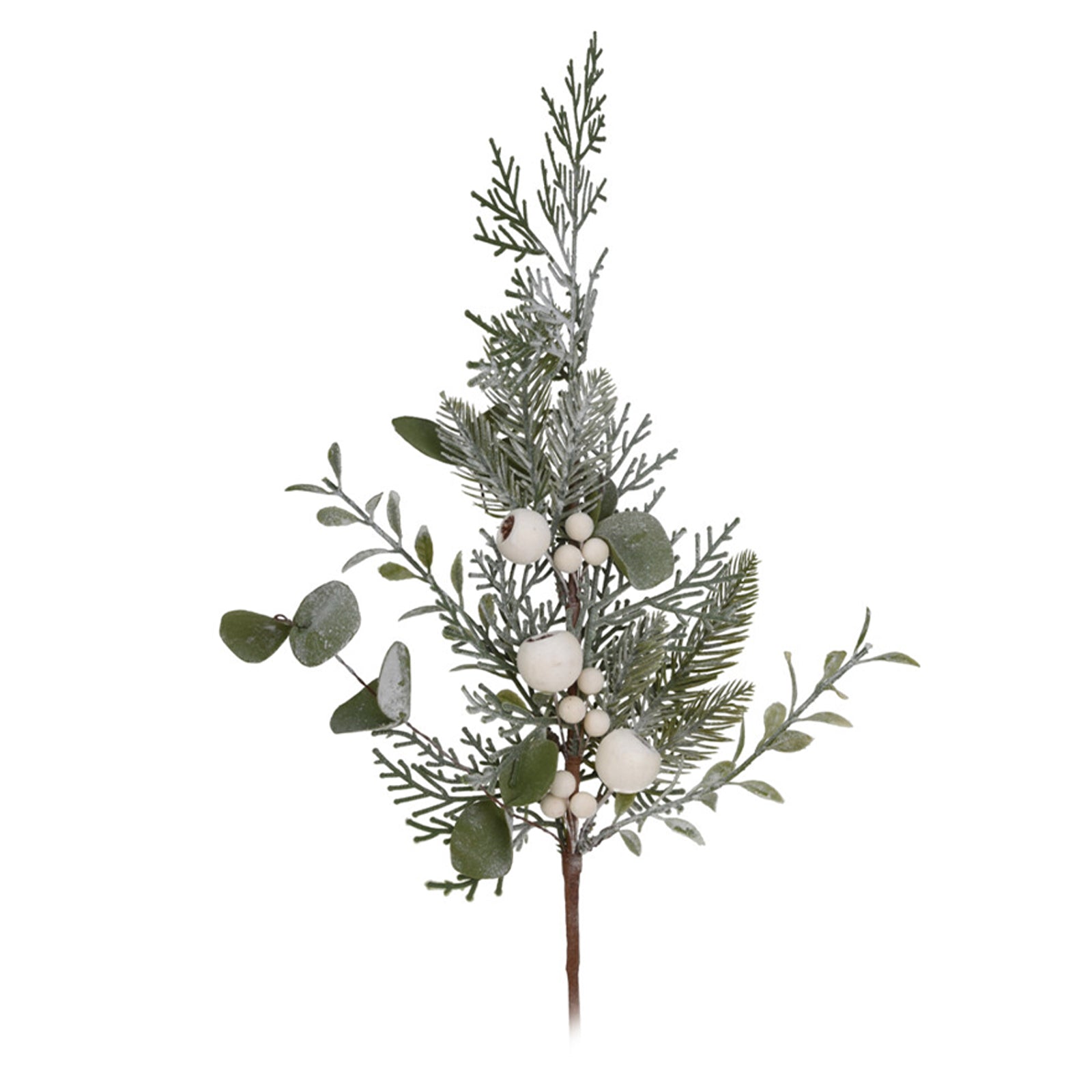 Il ramo decorativo natalizio raffigura un pino, arricchito con bacche bianche, ideale per abbellire ambienti durante le festività natalizie.