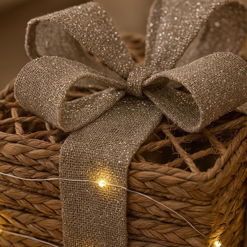 Il design dei regali è accentuato dall’integrazione di luci LED, che illuminano delicatamente l'interno dei pacchi. Le luci LED, collocate in modo strategico, emanano una luce calda e invitante che esalta i dettagli del metallo e crea un effetto scintillante.