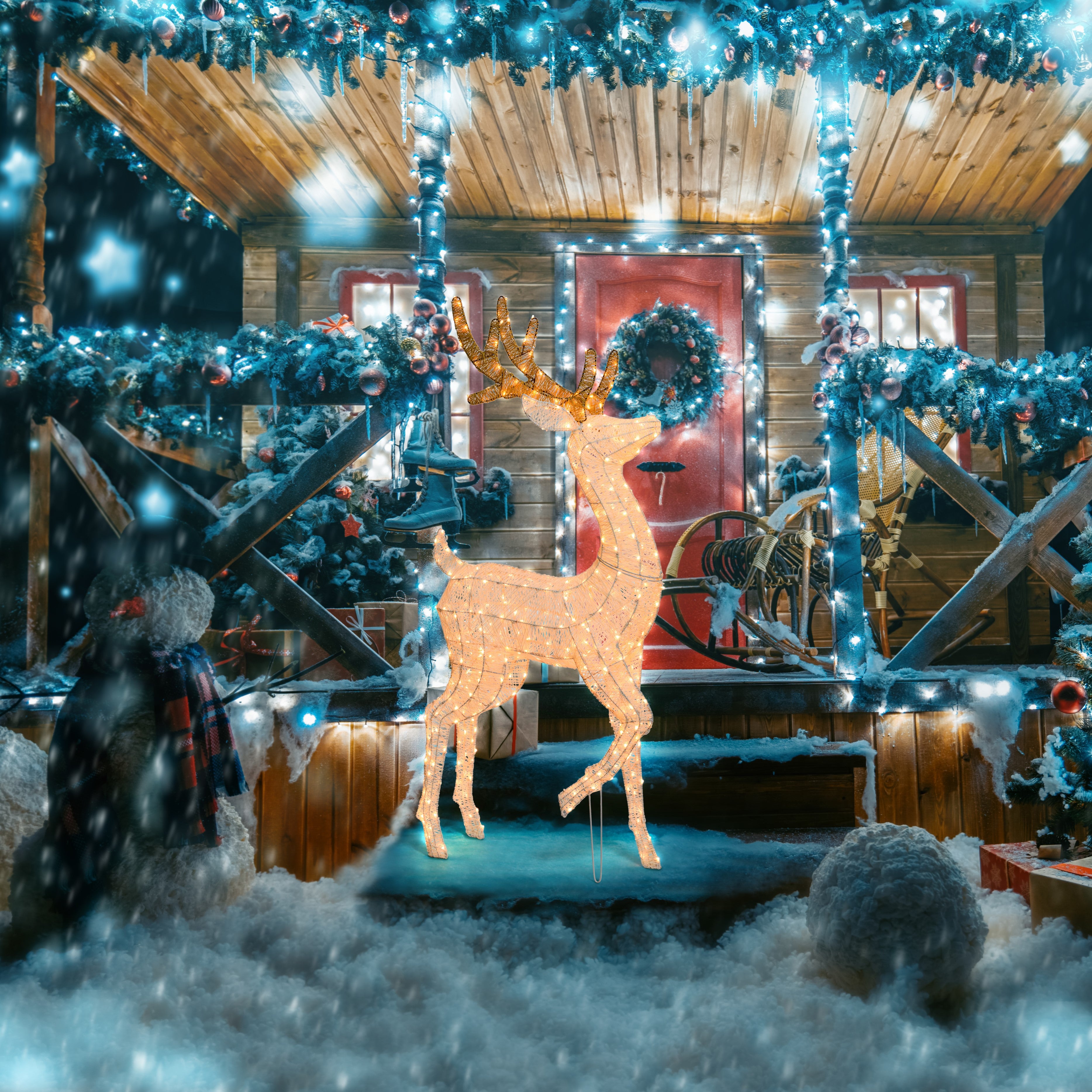 La renna luminosa ha una struttura in metallo verniciata di bianco. Questa è avvolta da fili color crema e marrone e di lucine led bianco extra caldo a luce fissa.