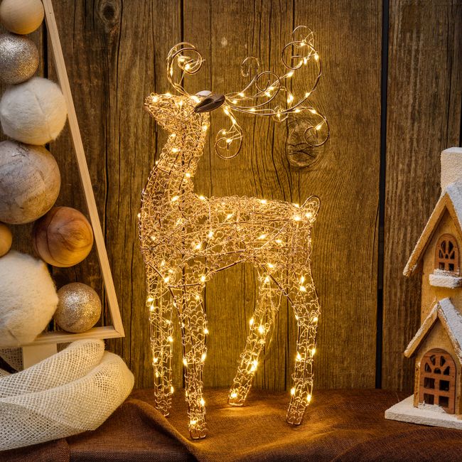 La renna fa parte della collezione di figure luminose realizzate in metallo lucido rame o champagne, tra cui puoi trovare pacchi regalo, stelle e alberi 3D.