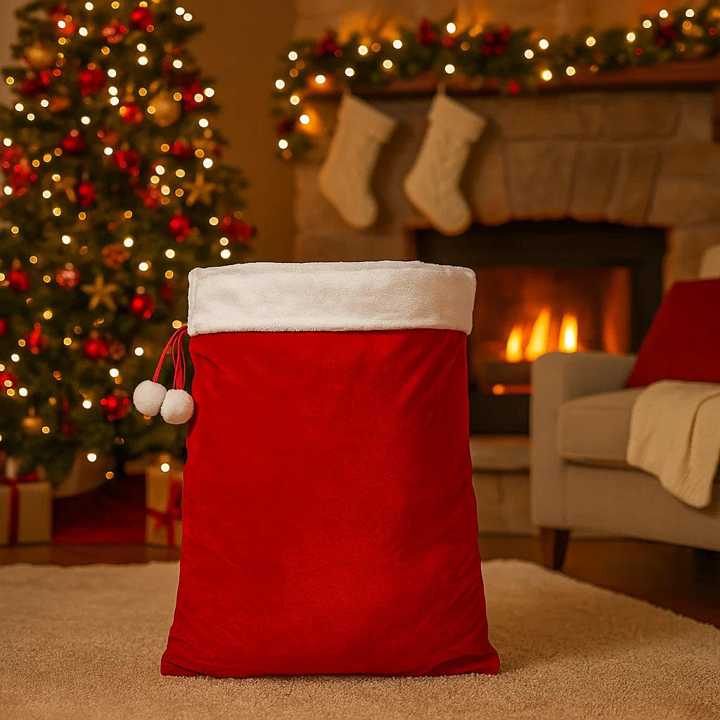 Realizzato in velluto rosso, materiale che evoca un senso di lusso e tradizione, questo sacco è morbido al tatto e visivamente accattivante. Il colore rosso intenso richiama immediatamente l'atmosfera delle feste, associandosi alle classiche decorazioni natalizie.