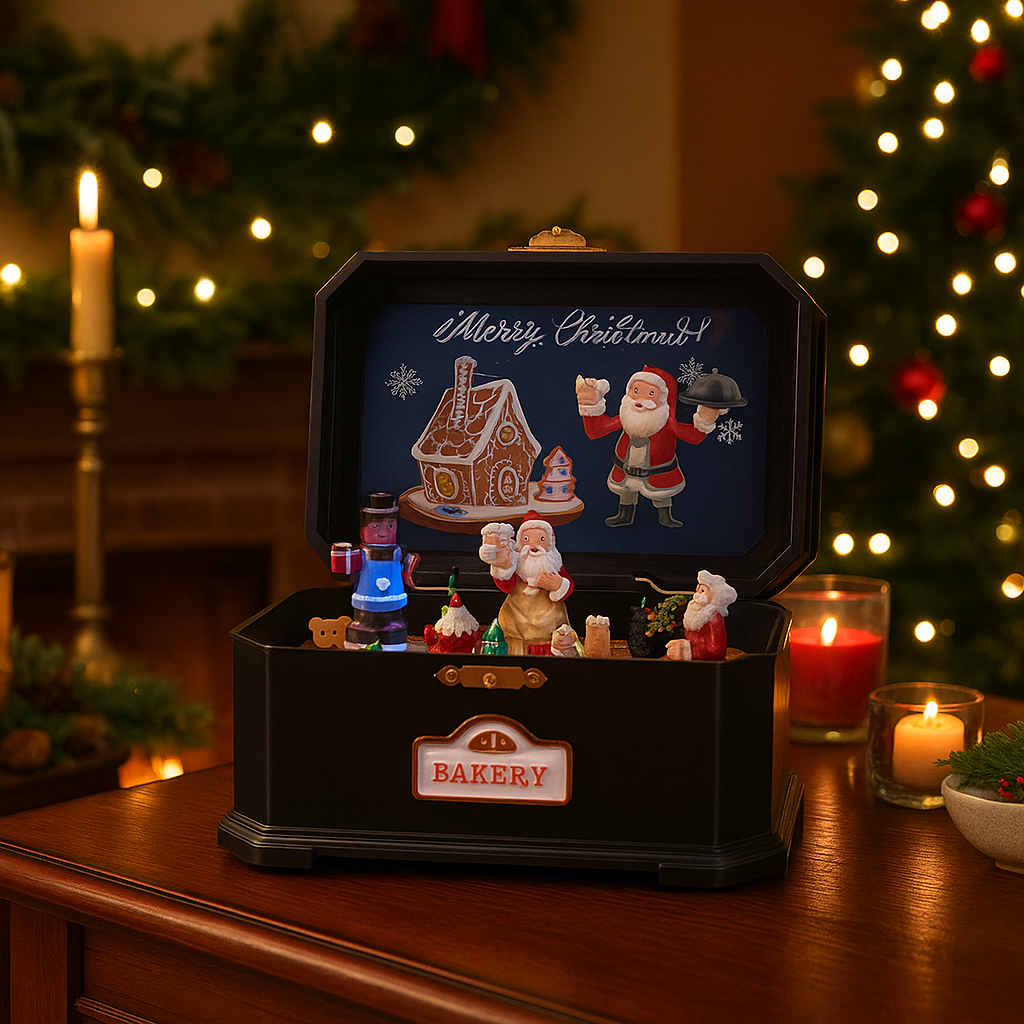 La scatola musicale con LED, scene e suoni è una decorazione natalizia incantevole che unisce elementi visivi e sonori per creare un'atmosfera festiva magica e coinvolgente.