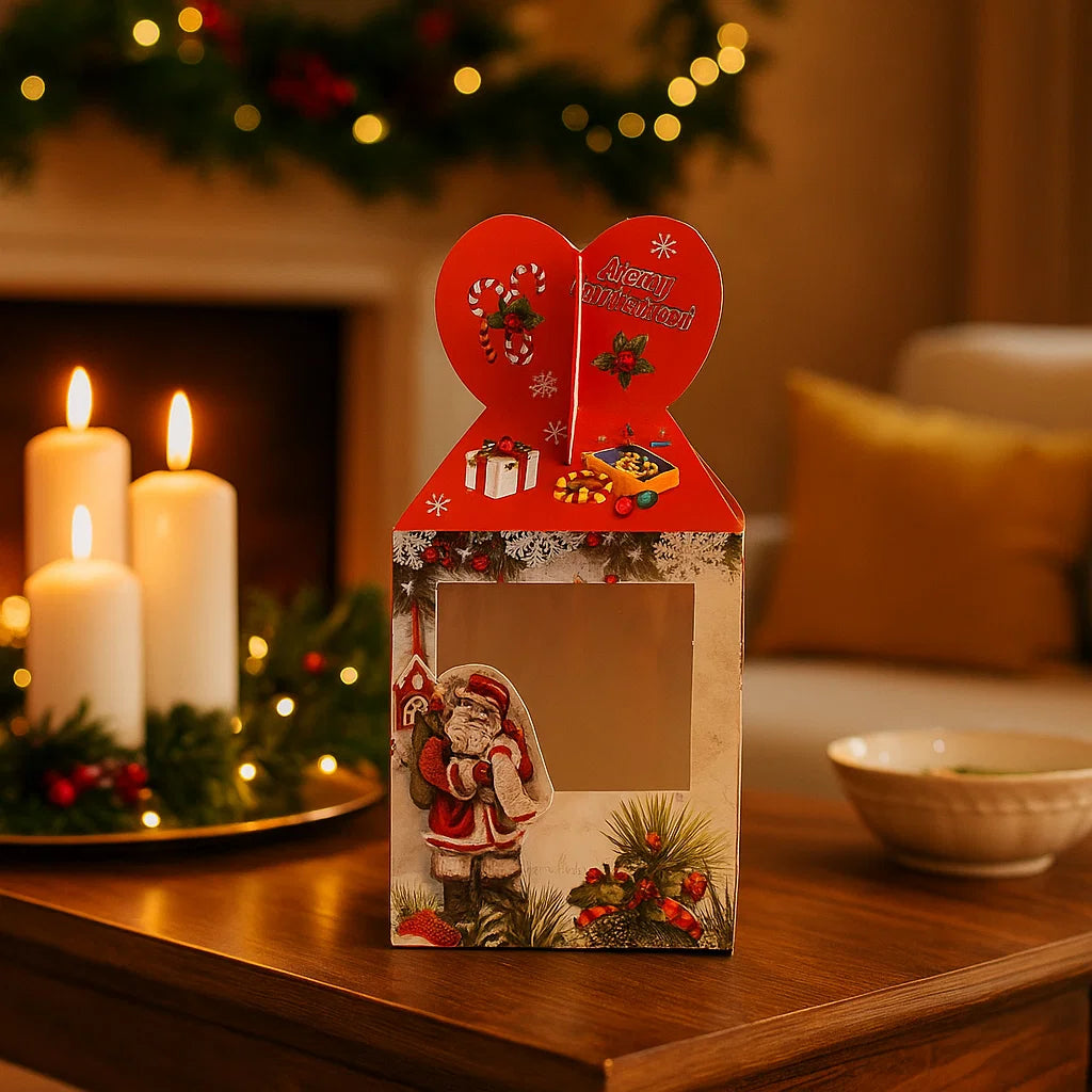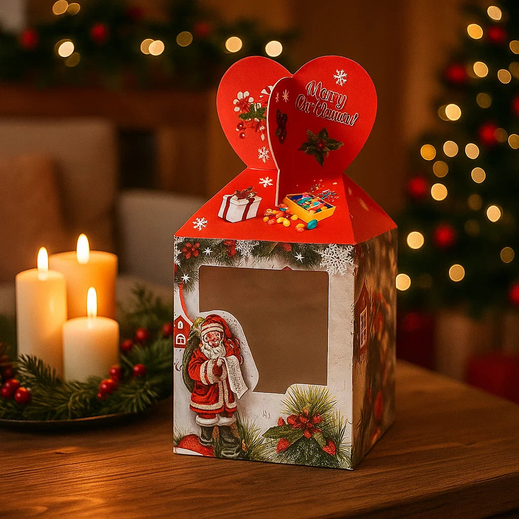Le decorazioni natalizie che adornano la scatola sono attentamente selezionate per evocare l'atmosfera delle festività.