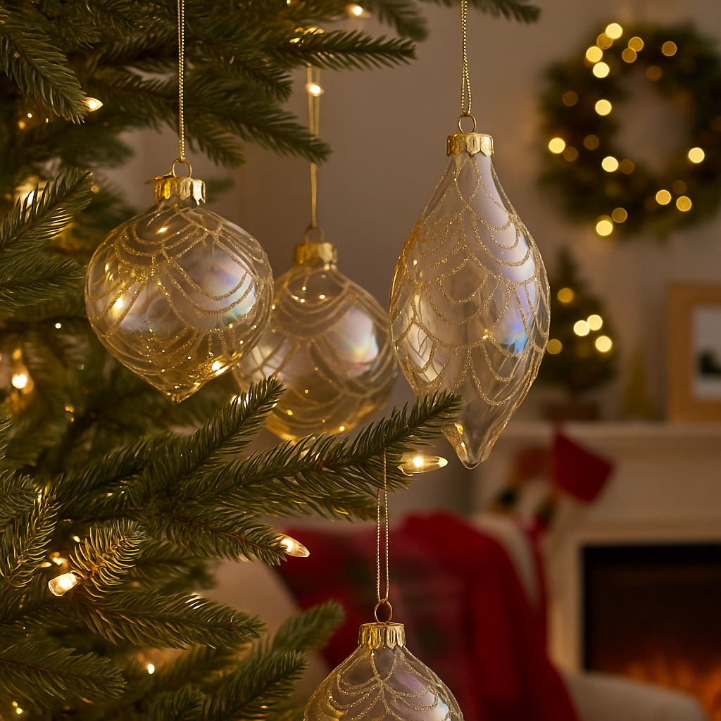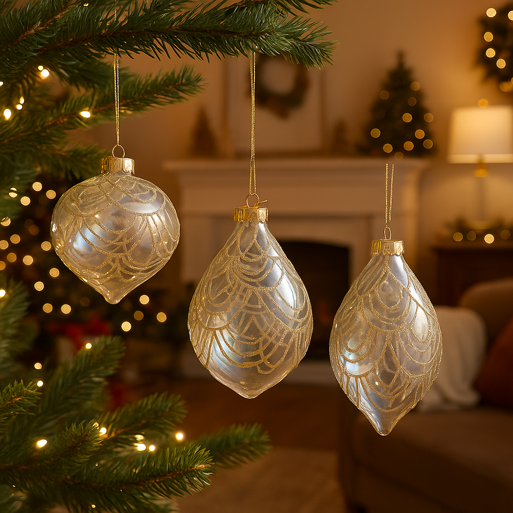 Il set di 3 pendagli in vetro "Prism" iridescenti è la scelta perfetta per chi desidera aggiungere un tocco di scintillio e sofisticazione alla propria decorazione natalizia.