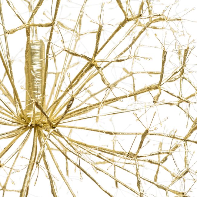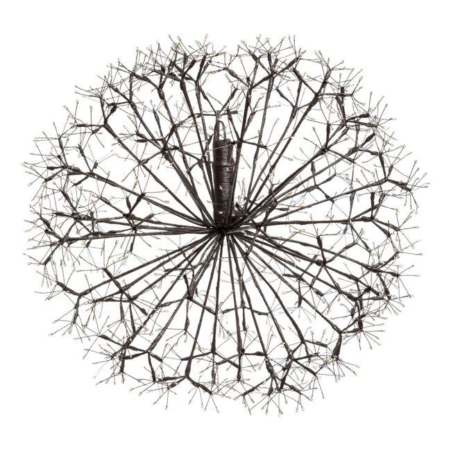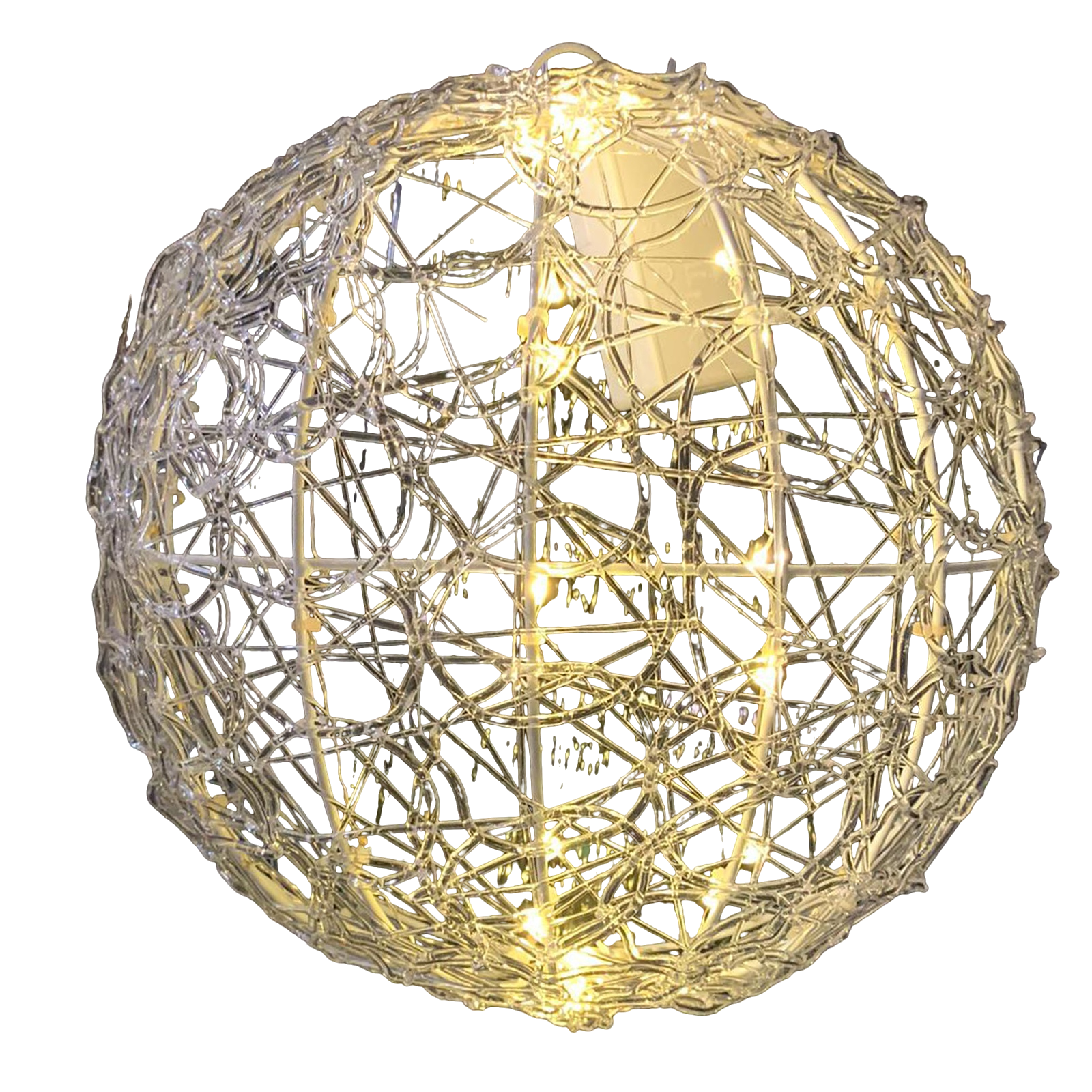 Sottilissimi fili argentati di micro led RGB multicolor avvolgono una sfera in metallo bianco alta e larga 30 centimetri.