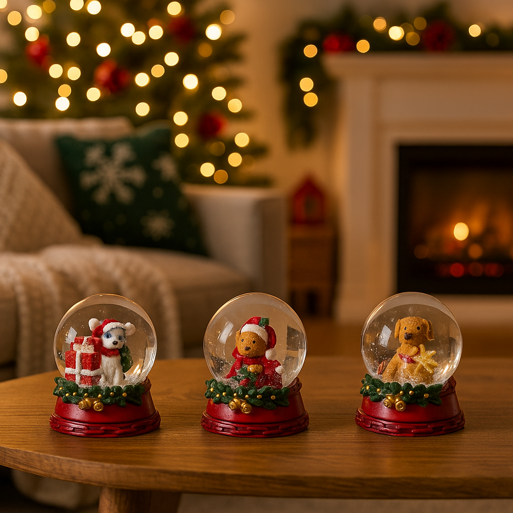 Una piccola snow globe che racchiude tutta la tenerezza del Natale: al suo interno un cagnolino finemente dipinto prende vita tra fiocchi di “neve” luccicanti quando la sfera viene agitata.
