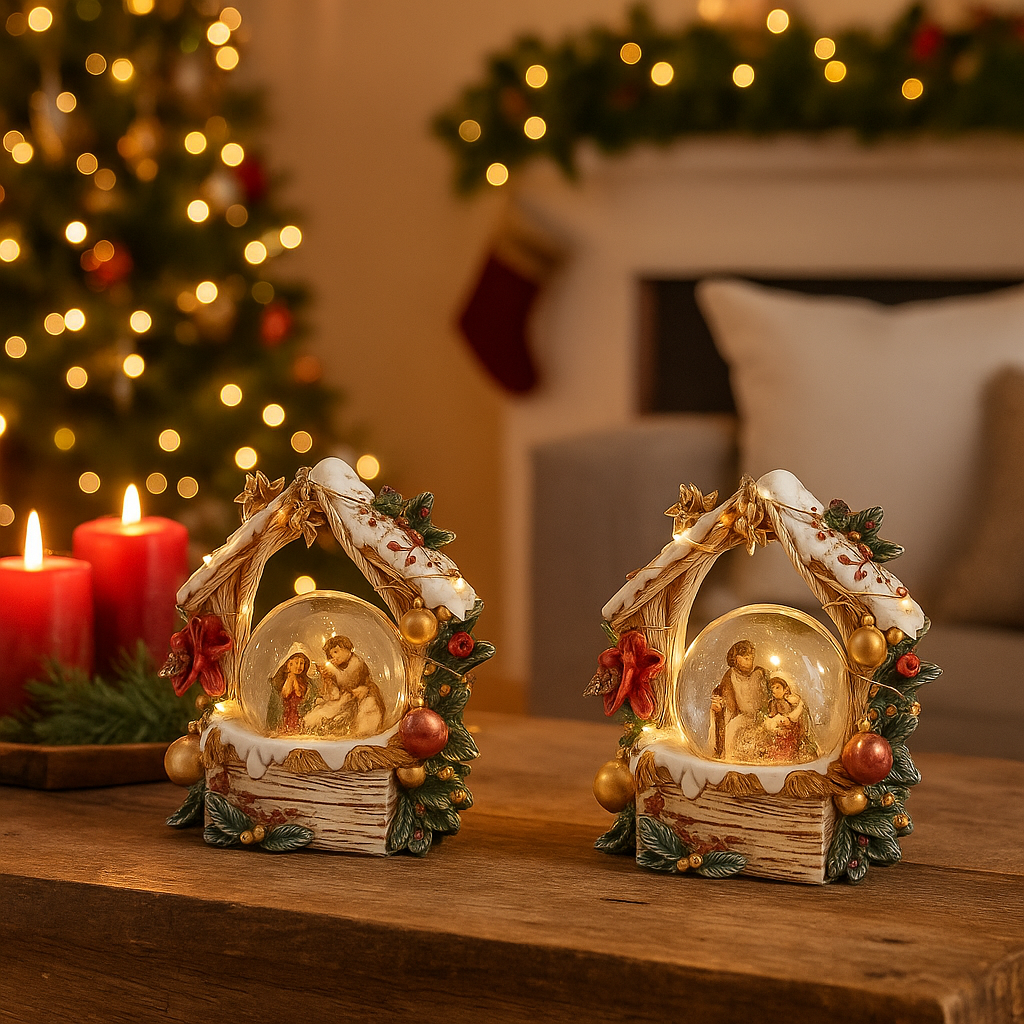 Una snow globe poetica che racchiude la scena della Natività e la illumina con delicati LED a luce calda.