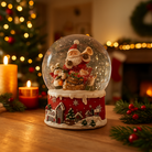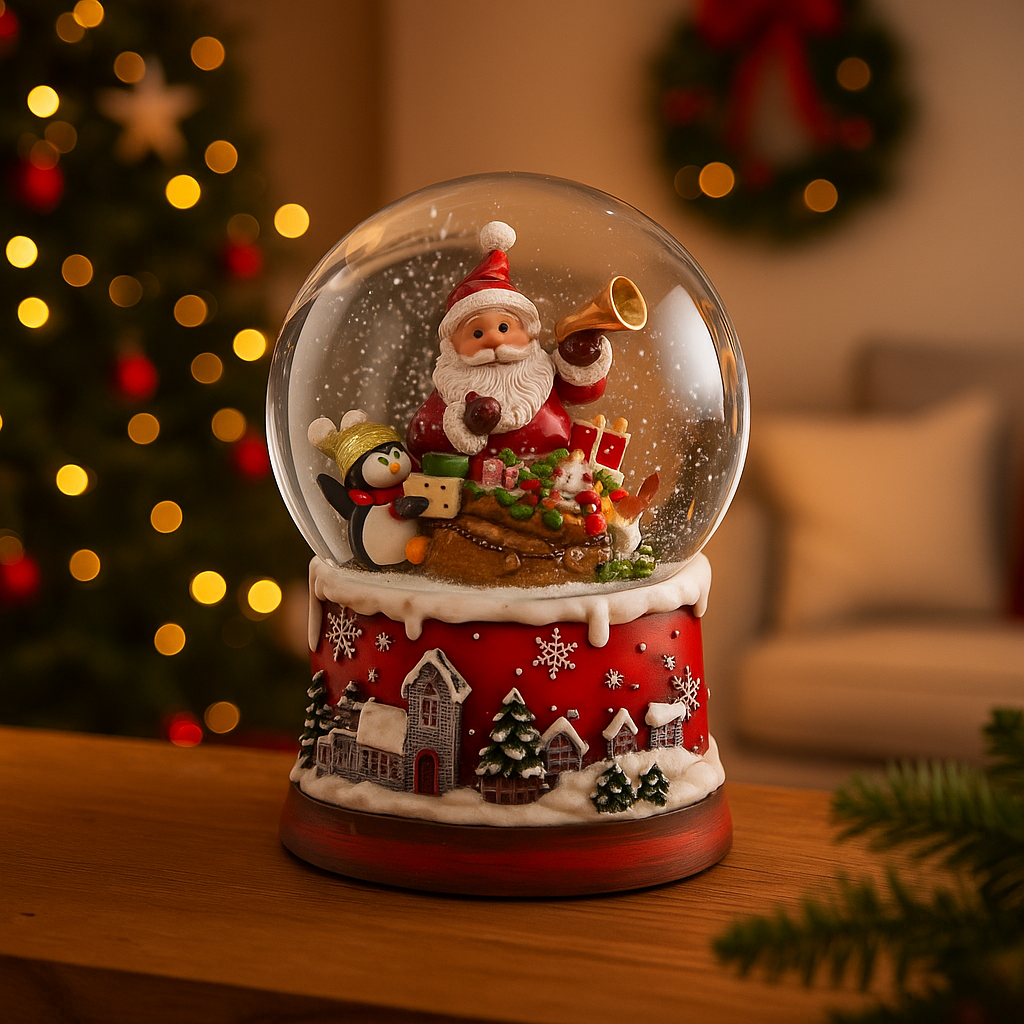 Aggiungi un tocco incantevole e musicale al tuo spazio natalizio con la nostra Sfera di Vetro con Acqua rappresentante Babbo Natale con sacco e trombetta.