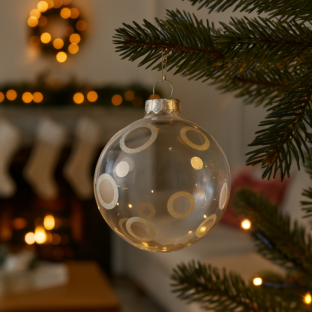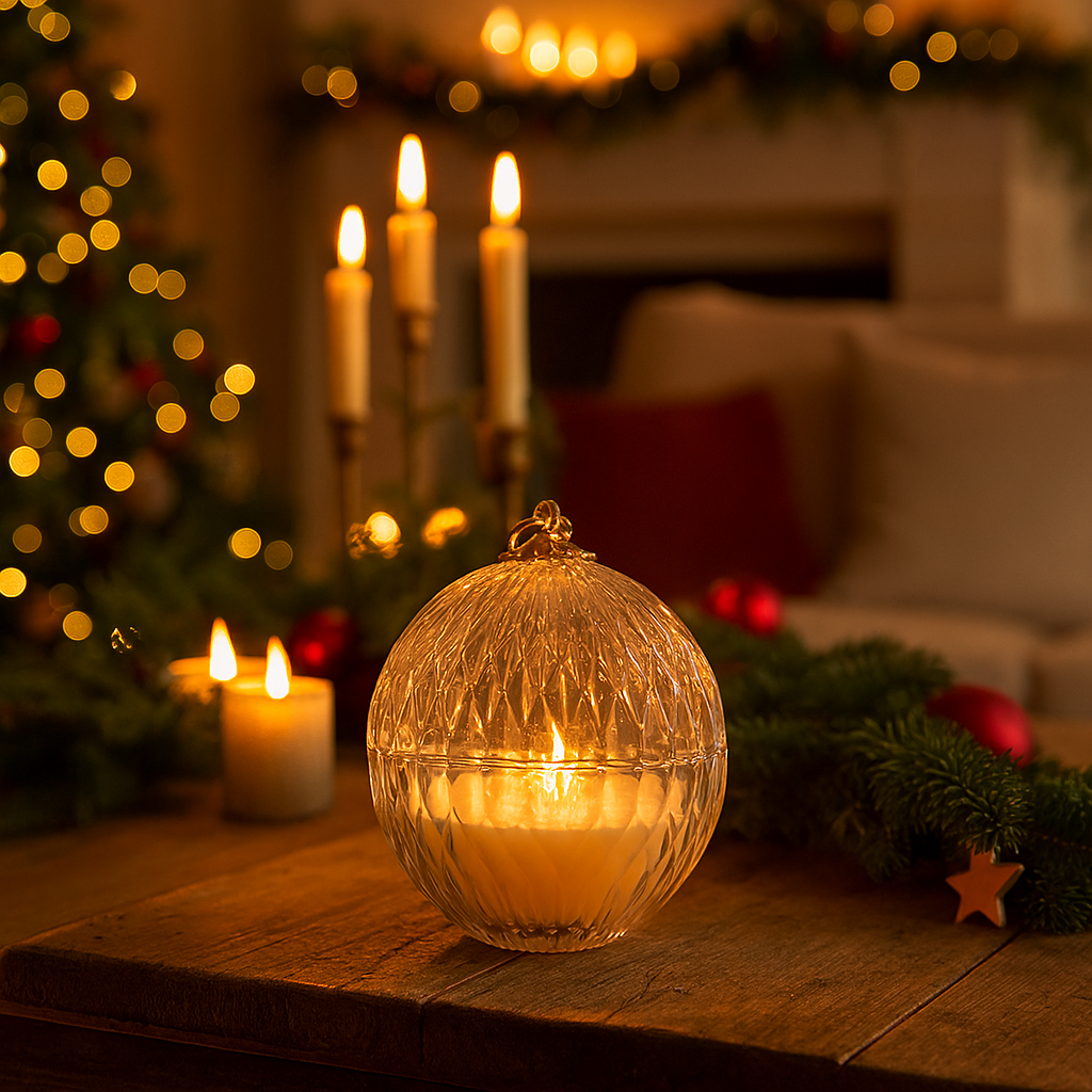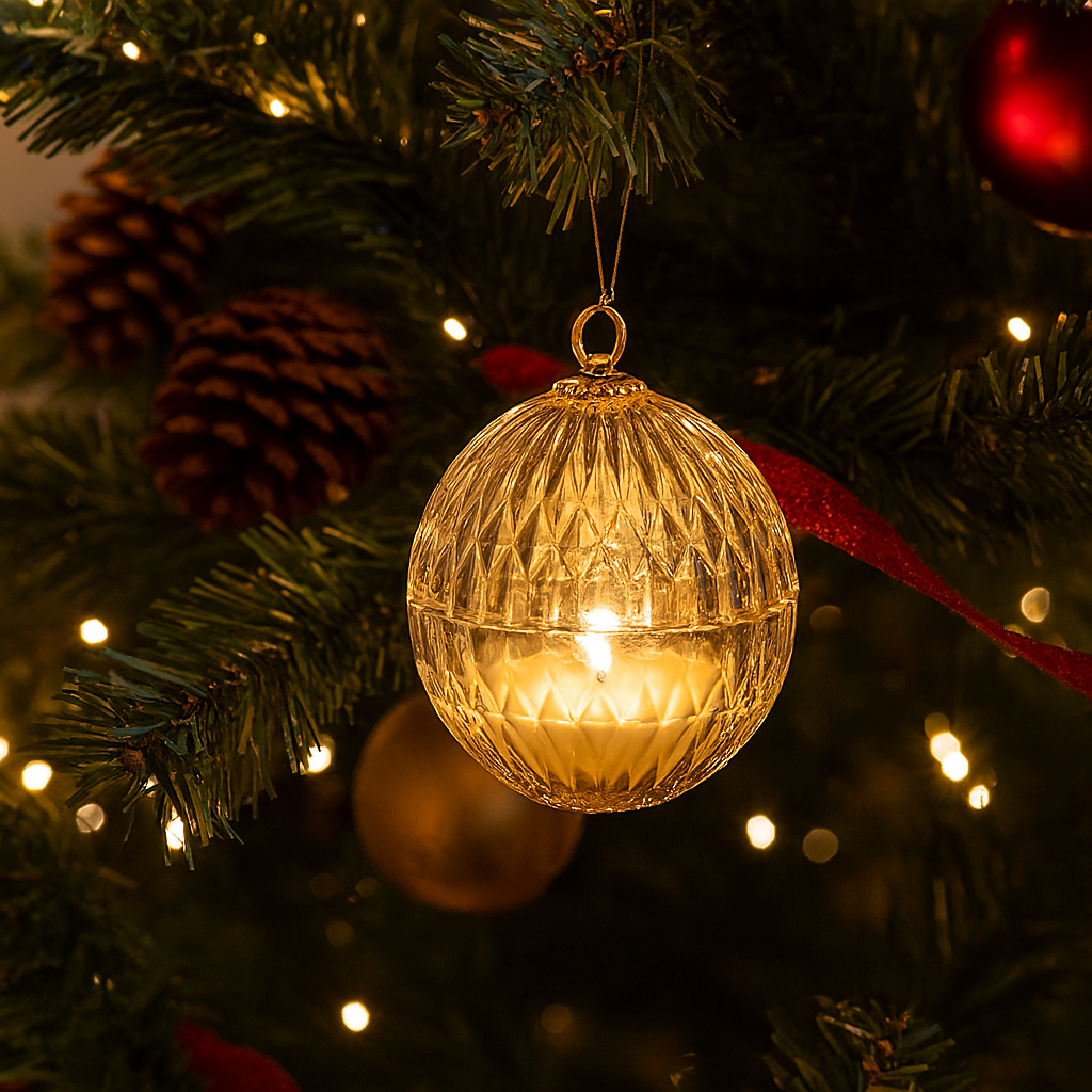 Scopri la sfera in vetro con candela e gancio dorato, l’elemento perfetto per aggiungere un’atmosfera calda e luminosa alle tue decorazioni natalizie.