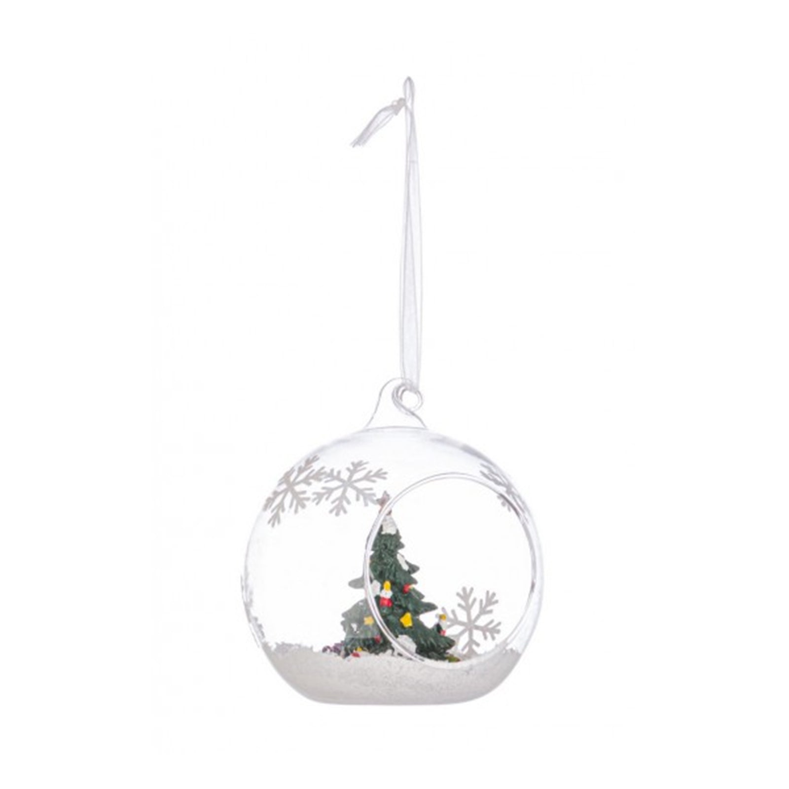 Realizzata in vetro trasparente, la sfera racchiude al suo interno una piccola rappresentazione di un pino, che evoca l'immagine di una tipica scena invernale.
