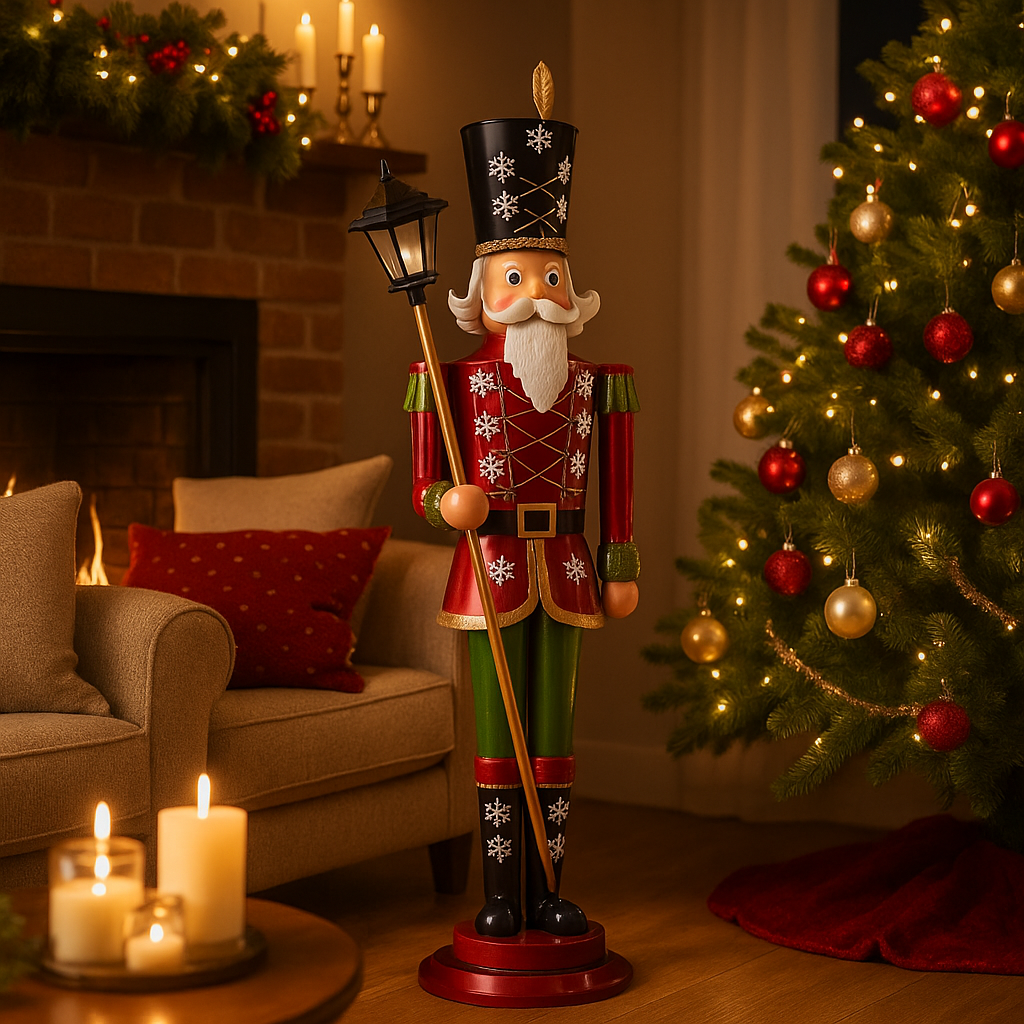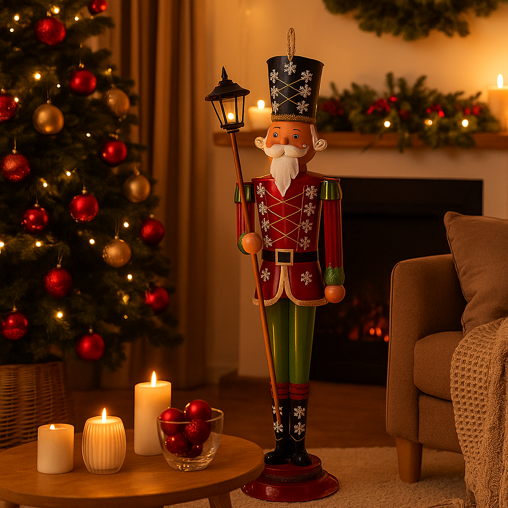 Il modello presenta un soldato Schiaccianoci con uniforme di colore rosso, verde e oro, un elmetto nero e due bacchette per tamburo, perfetto come decorazione natalizia.