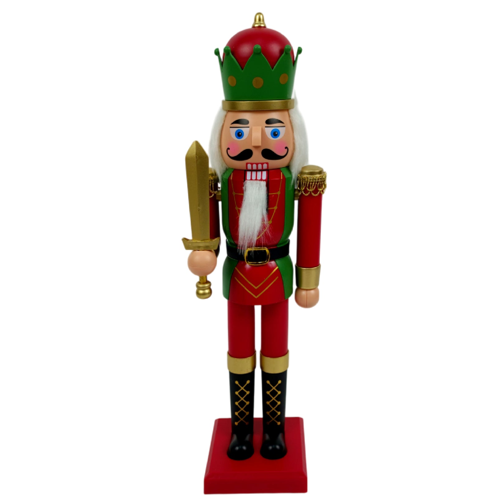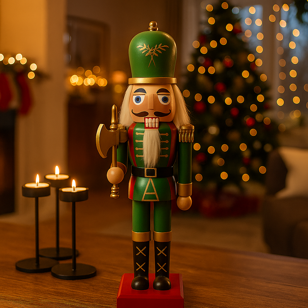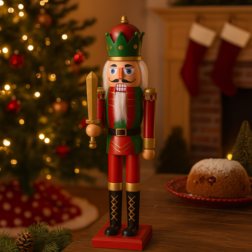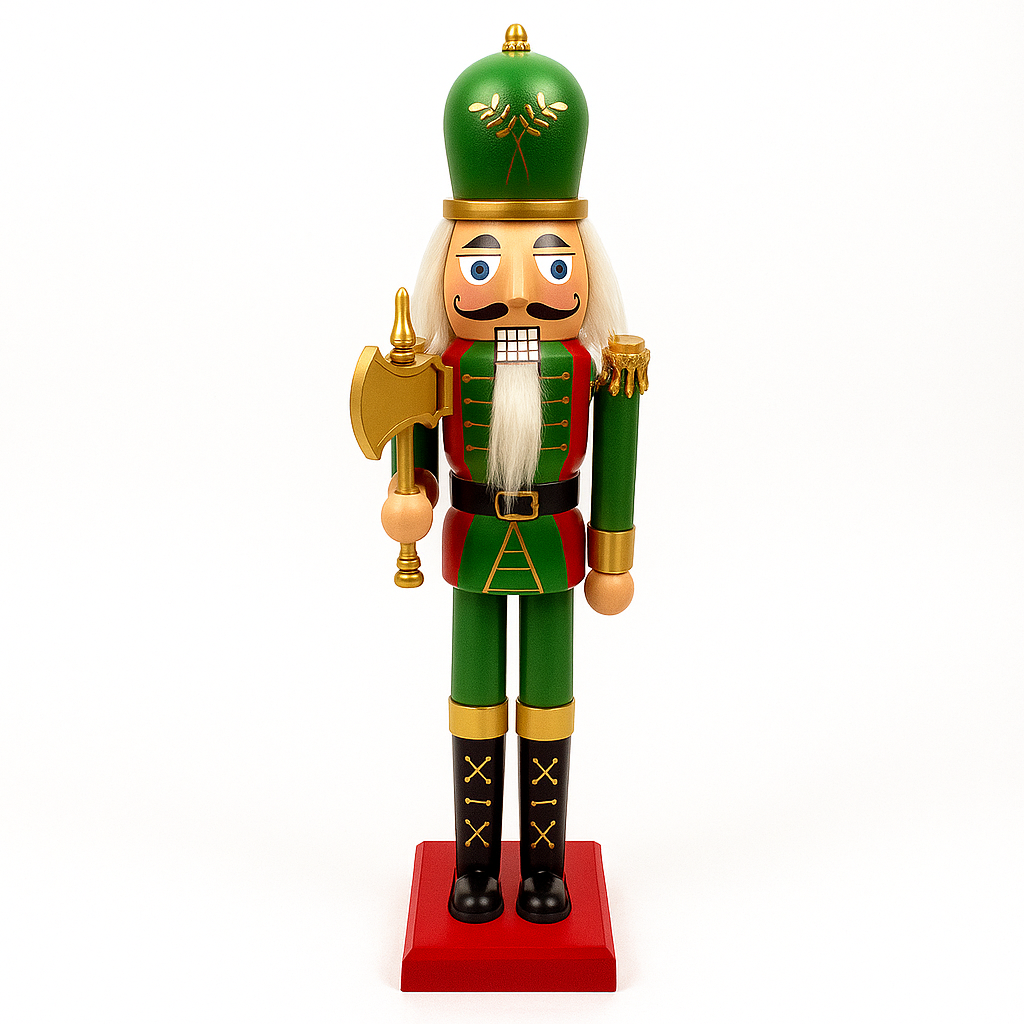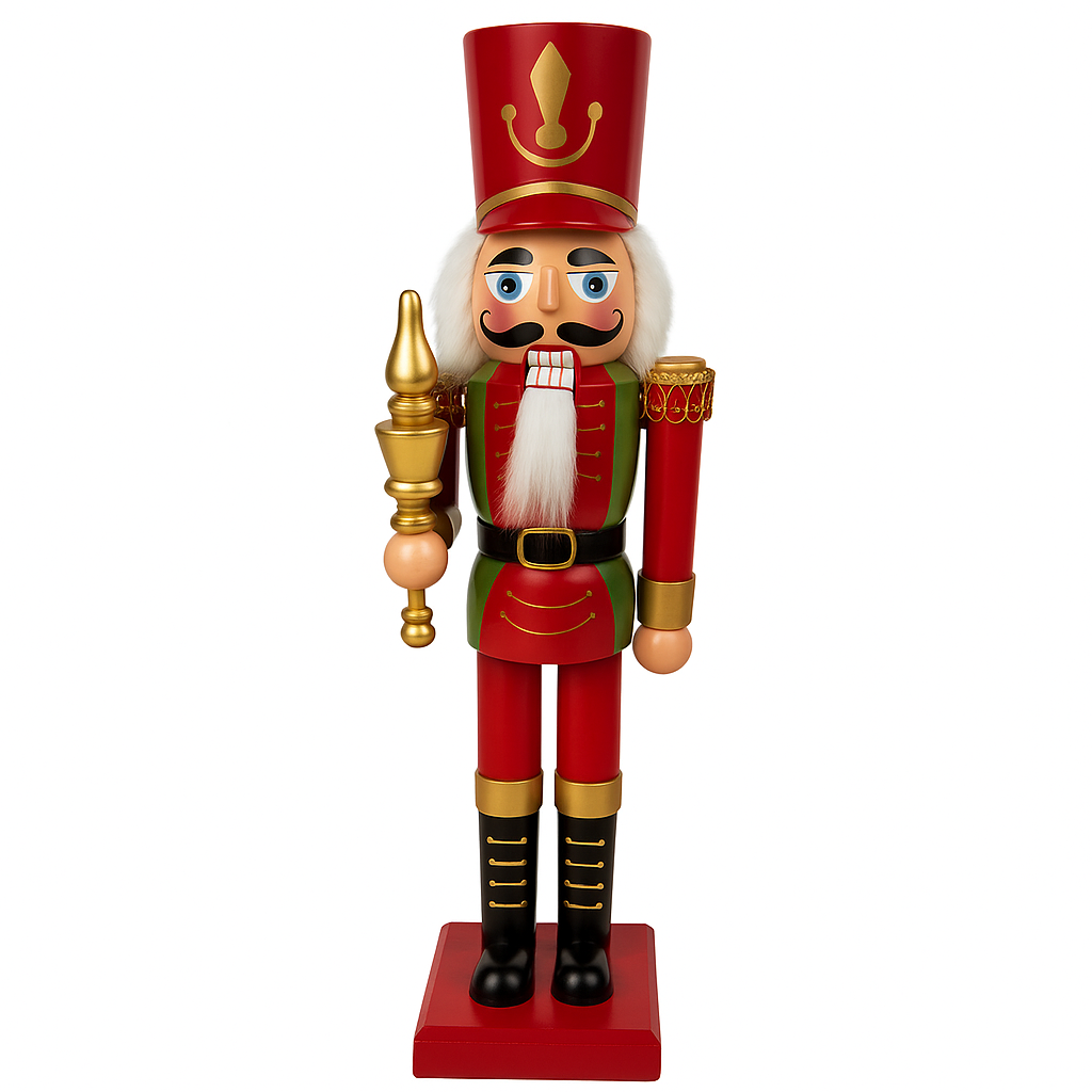 La figura, scolpita con cura e dipinta a mano, rappresenta un classico schiaccianoci in tenuta regale, vestito con una giacca elaborata dai toni festivi come il rosso o il verde arricchita da dettagli dorati, spalline decorate e bottoni ben definiti, che conferiscono un’aria maestosa e ricca di carattere.
