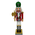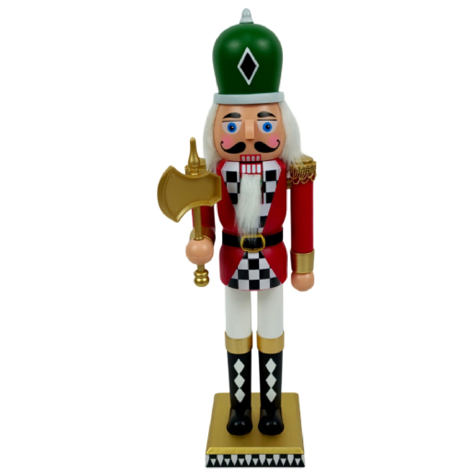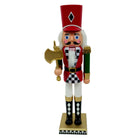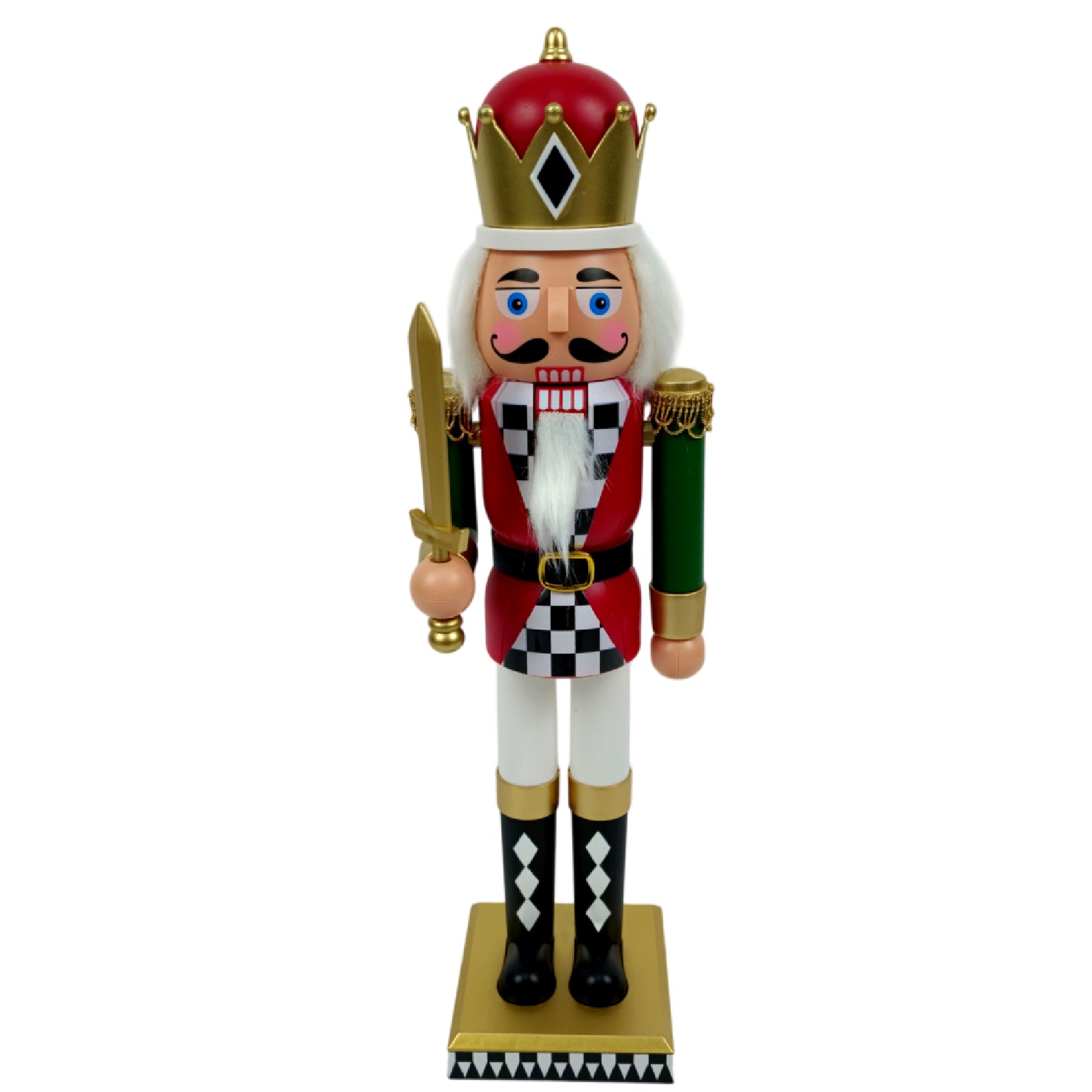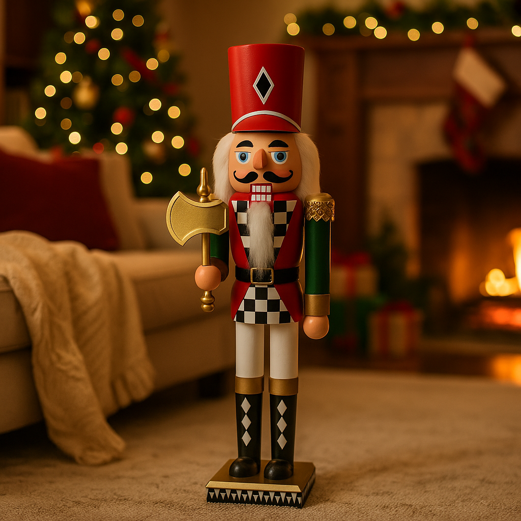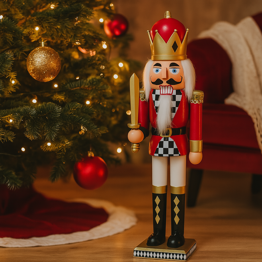 La figura, scolpita con cura e dipinta a mano, rappresenta un classico schiaccianoci in tenuta regale, vestito con una giacca elaborata dai toni festivi come il rosso o il verde arricchita da dettagli dorati, spalline decorate e bottoni ben definiti, che conferiscono un’aria maestosa e ricca di carattere.