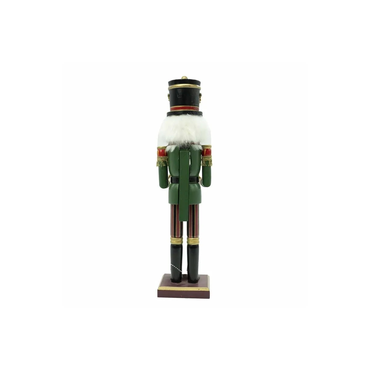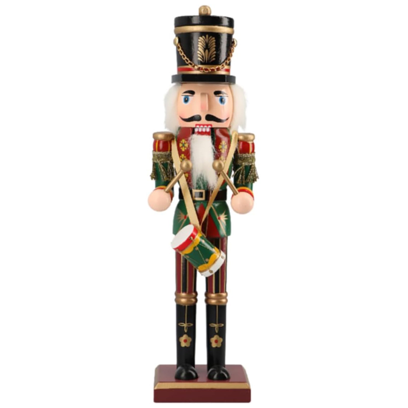 Il modello presenta un soldato Schiaccianoci con uniforme di colore rosso, verde e oro, un elmetto nero e due bacchette per tamburo.