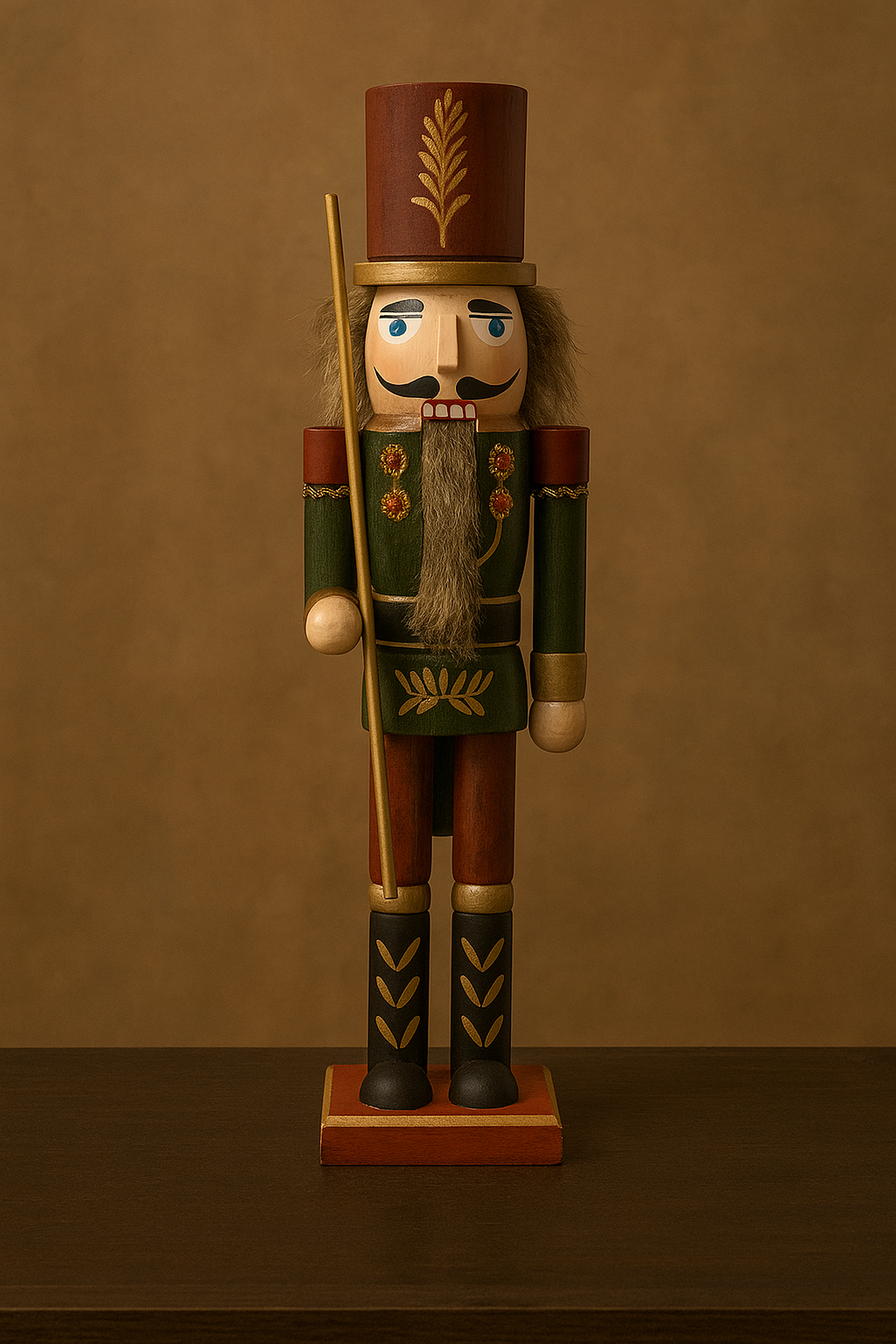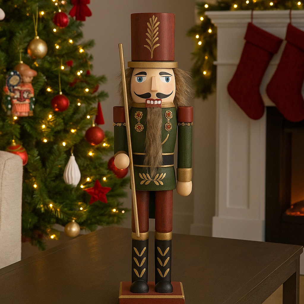 Realizzato con materiali di qualità, presenta una struttura solida e dettagli finemente dipinti che riproducono l'iconico aspetto del classico schiaccianoci, con il suo caratteristico cappello alto, la giacca ornata e l’espressione solenne e fiera.