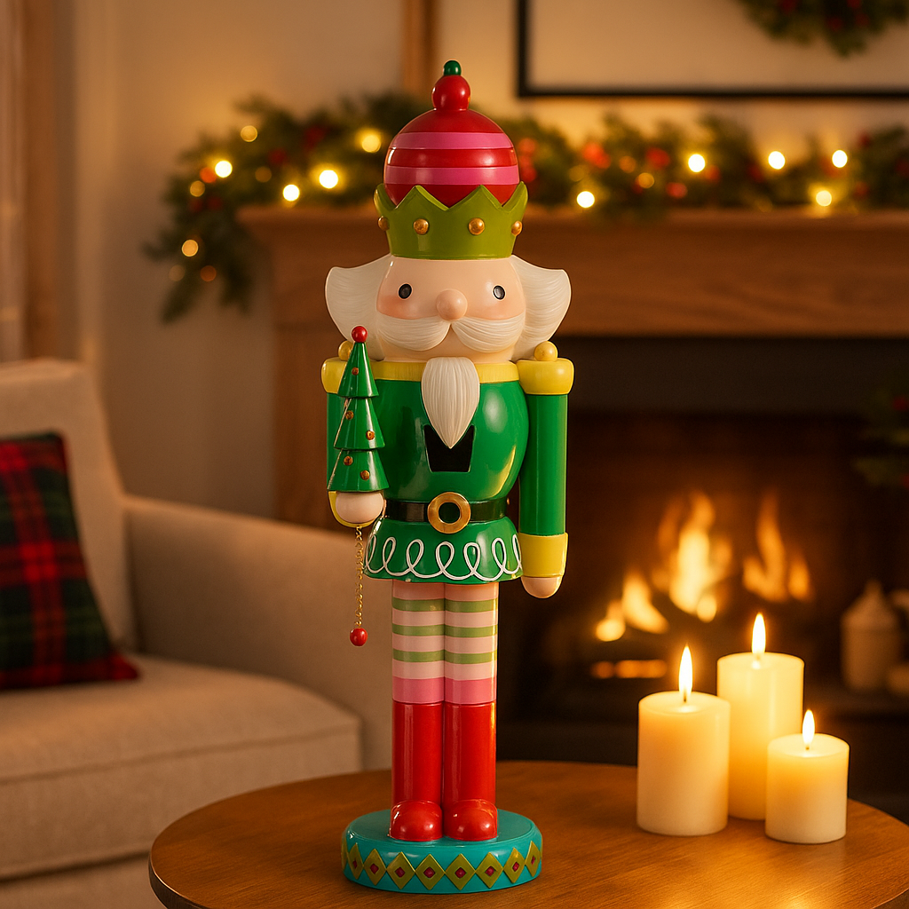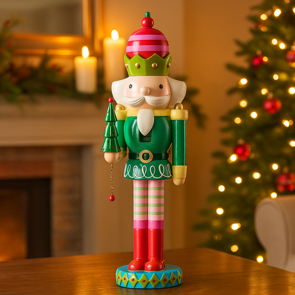 - Design Classico: Rappresenta il tradizionale soldatino schiaccianoci con un tocco di originalità grazie al colore verde e alle fantasie decorative.