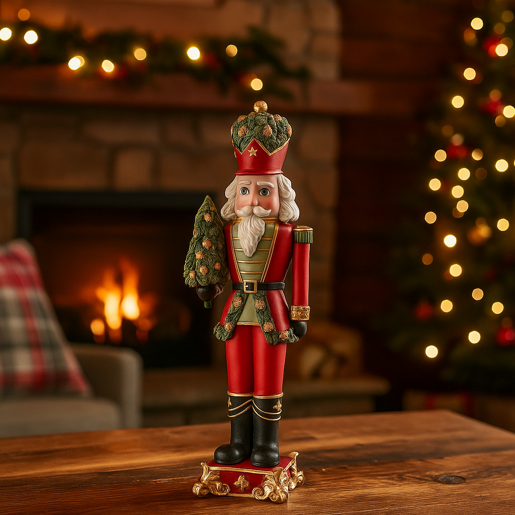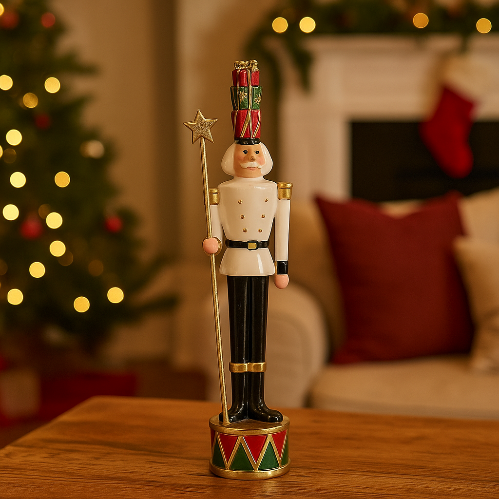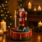 Questo piccolo Villaggio di Natale raffigura un Soldato Schiaccianoci che si erge fiero su un piedistallo luminoso allestito con un drappo rosso e oro. Sopra questa base ruota un piccolo trenino di Natale che trasporta giocattoli e decorazioni natalizie. Il bordo del piedistallo è circondato da LED RGB cambia colore, che illuminano le figure creando un'atmosfera festosa.