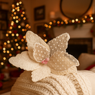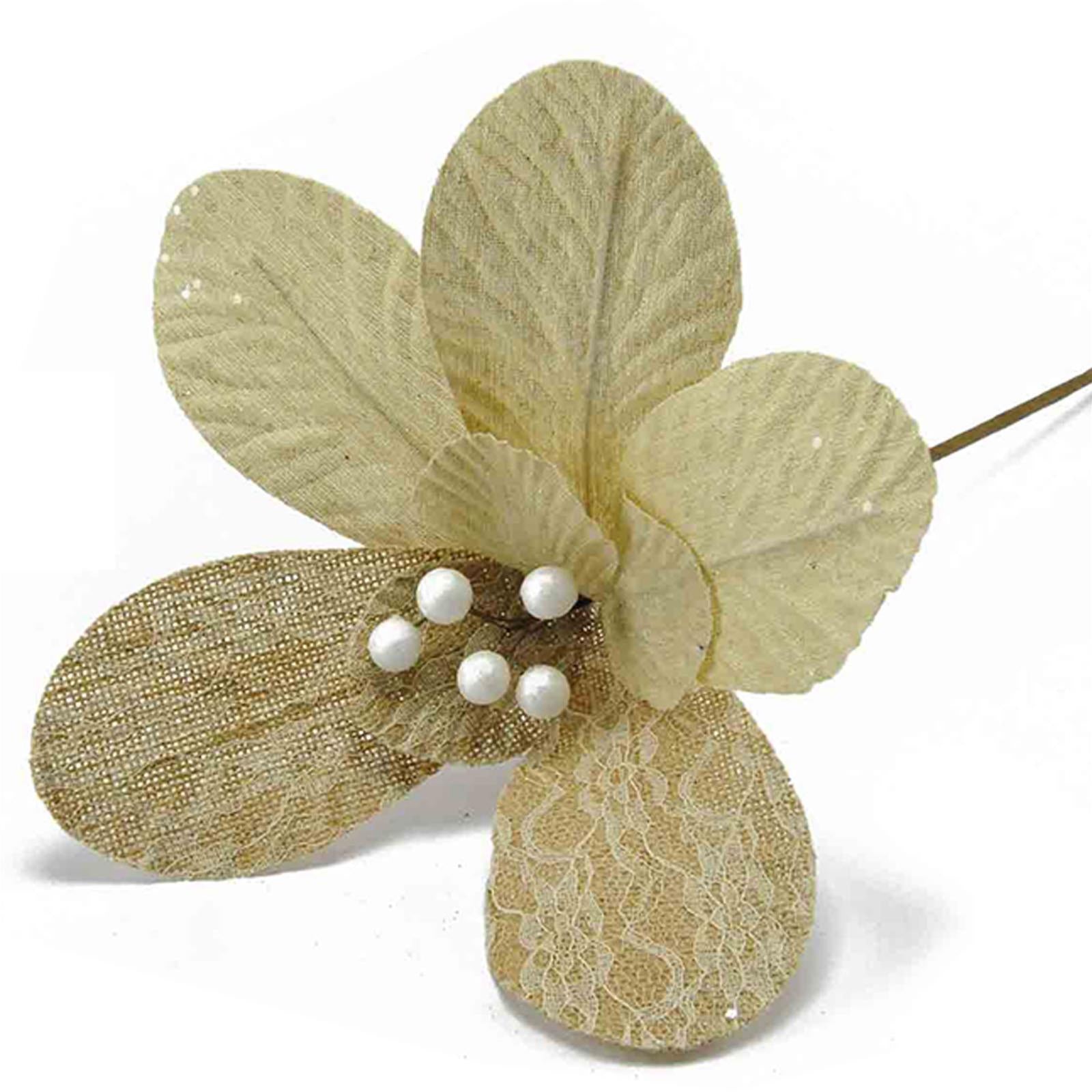 Aggiungi un tocco di charme naturale alle tue decorazioni natalizie con questo raffinato fiore in tessuto beige, realizzato in juta a pois.