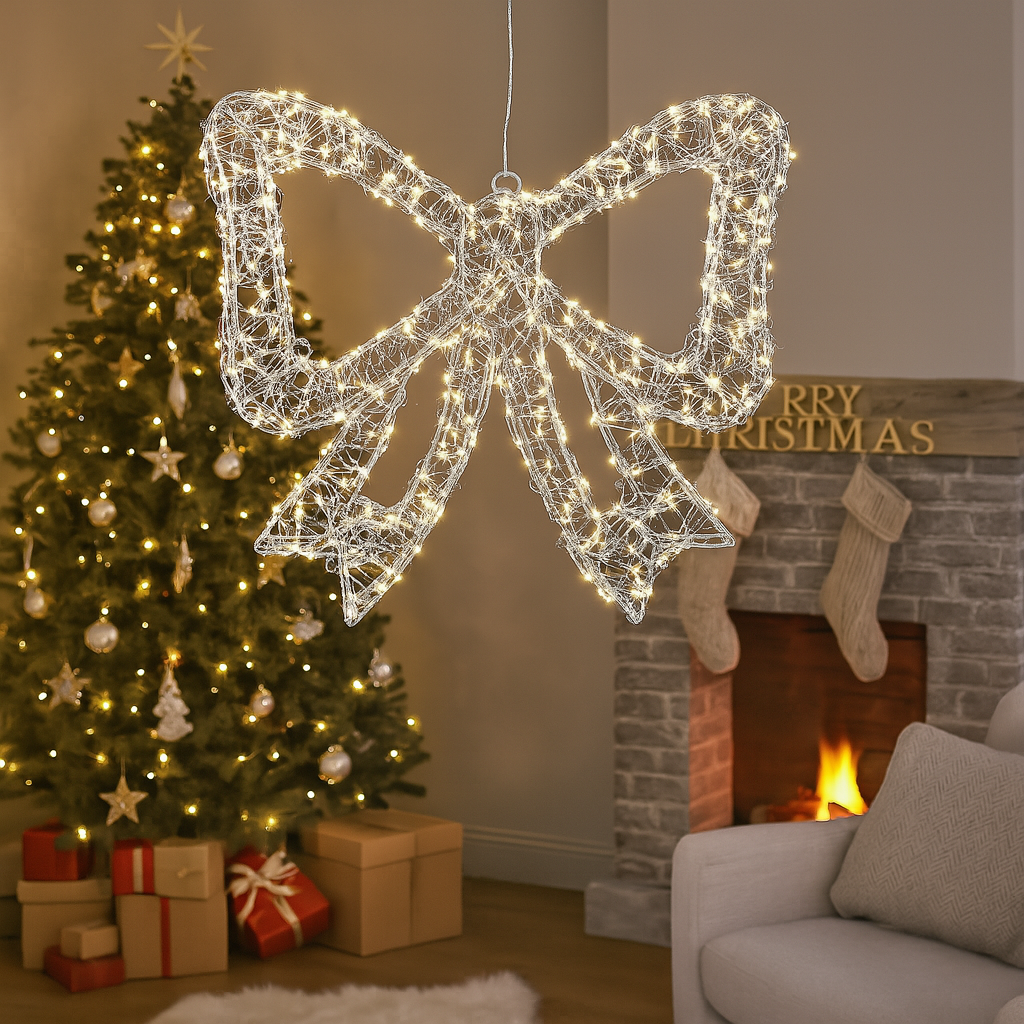 Il design raffinato e i dettagli luminosi rendono questo fiocco ideale per completare alberi, composizioni o come decorazione indipendente. Robusta e resistente, è pensata per essere utilizzata sia all’interno che all’esterno.