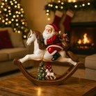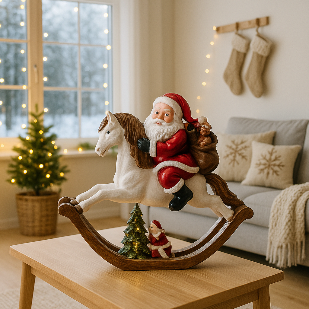 Questa graziosa statuetta raffigurante Babbo Natale sul cavallo a dondolo è la decorazione perfetta per aggiungere un tocco fiabesco e tradizionale alle tue feste natalizie.