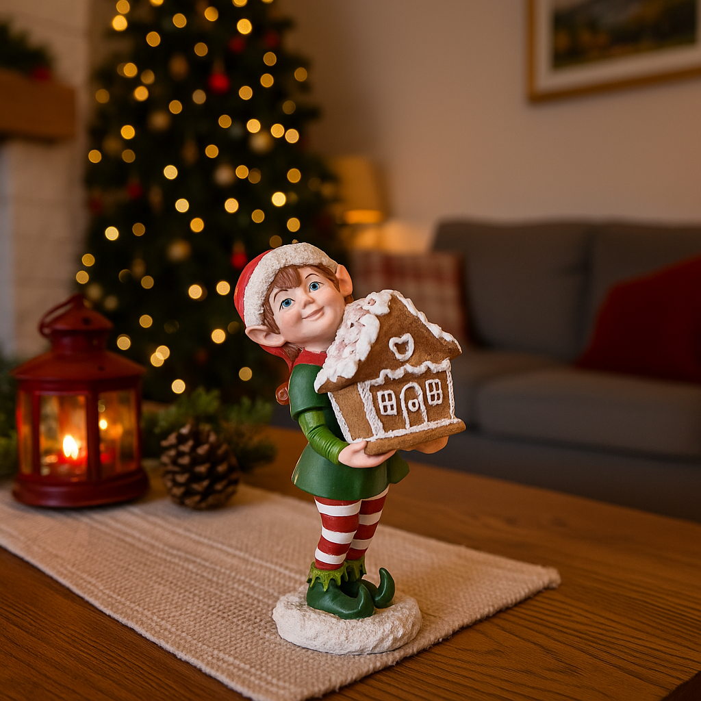 - Statuetta di elfo con casetta pan di zenzero, creando un'immagine affascinante e festosa.