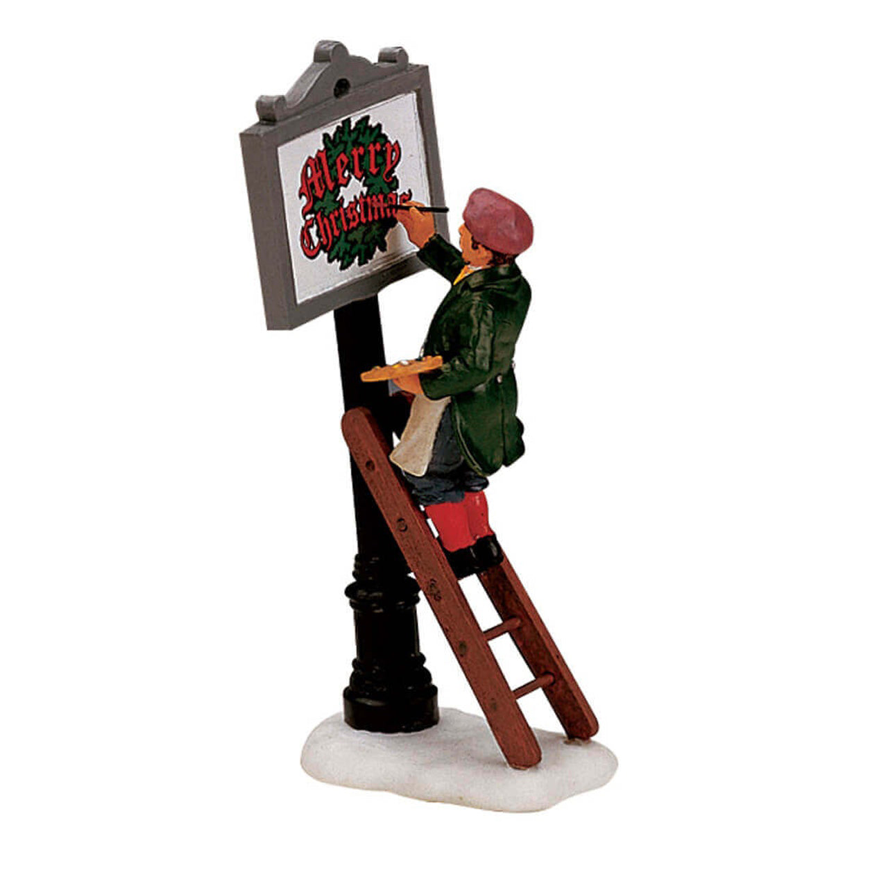 Il pittore dipinge con il pennello un cartello, scrivendo "Merry Christmas". Per raggiungere il cartello sta usando una scala.