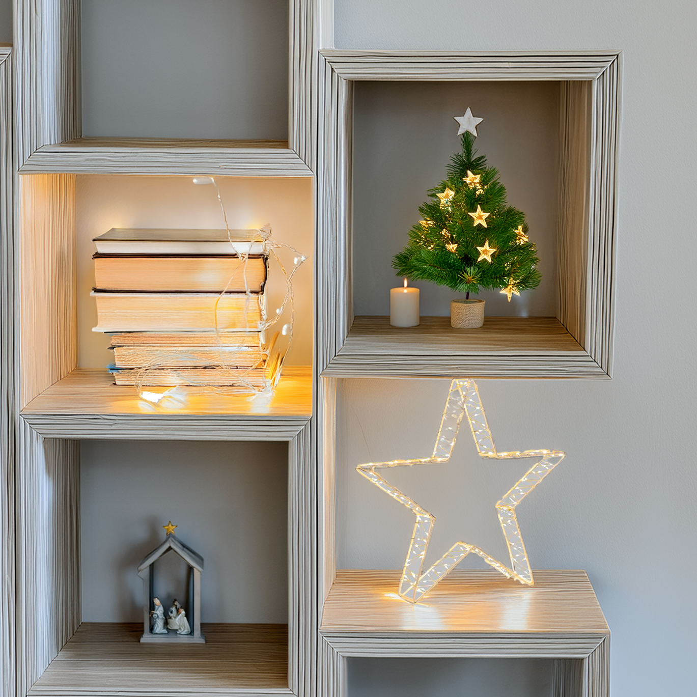 La stella luminosa è per interno, il portabatterie integrato alla base ha una levetta ON/OFF con cui puoi anche attivare un timer 8/16 ore: in questo modo la figura si spegne in automatico dopo 8 ore e si riaccende dopo 16.