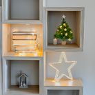 Il bordo tridimensionale è illuminato da MicroLED bianco caldo integrati su un sottilissimo cavo in metallo argento che riempie completamente lo spessore della stella. Il sistema di illuminazione utilizza sia LED a luce fissa che FlashLED con lampeggio lento che creano un gioco di luci dinamico ma discreto, valorizzando la forma tridimensionale della decorazione. L'effetto FlashLED non è disattivabile.