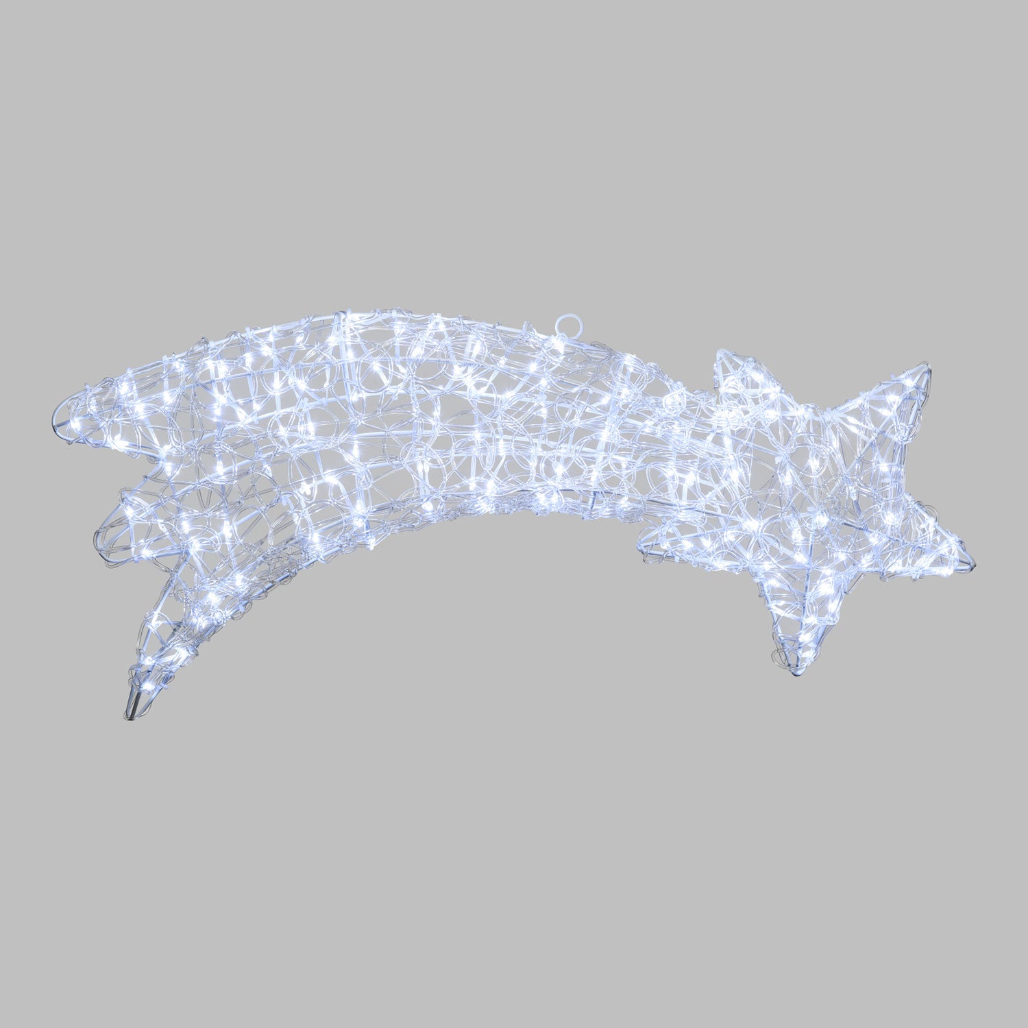 Stella Cometa 75cm in acrilico con 140 gocce led bianco alta luminosità 360° realizzata con telaio in metallo verniciato bianco, dotata di trasformatore e cavo di alimentazione trasparente per uso interno ed esterno.