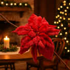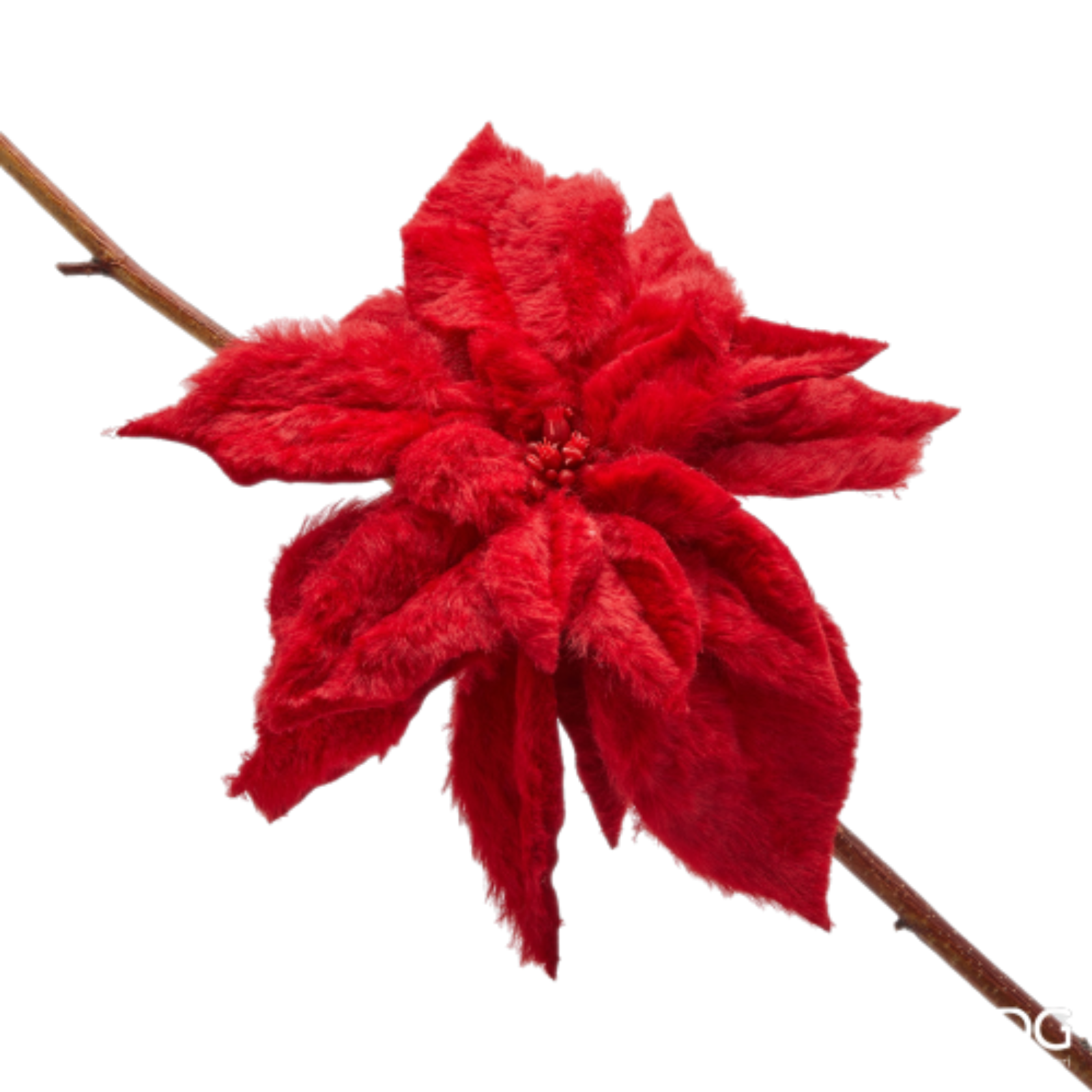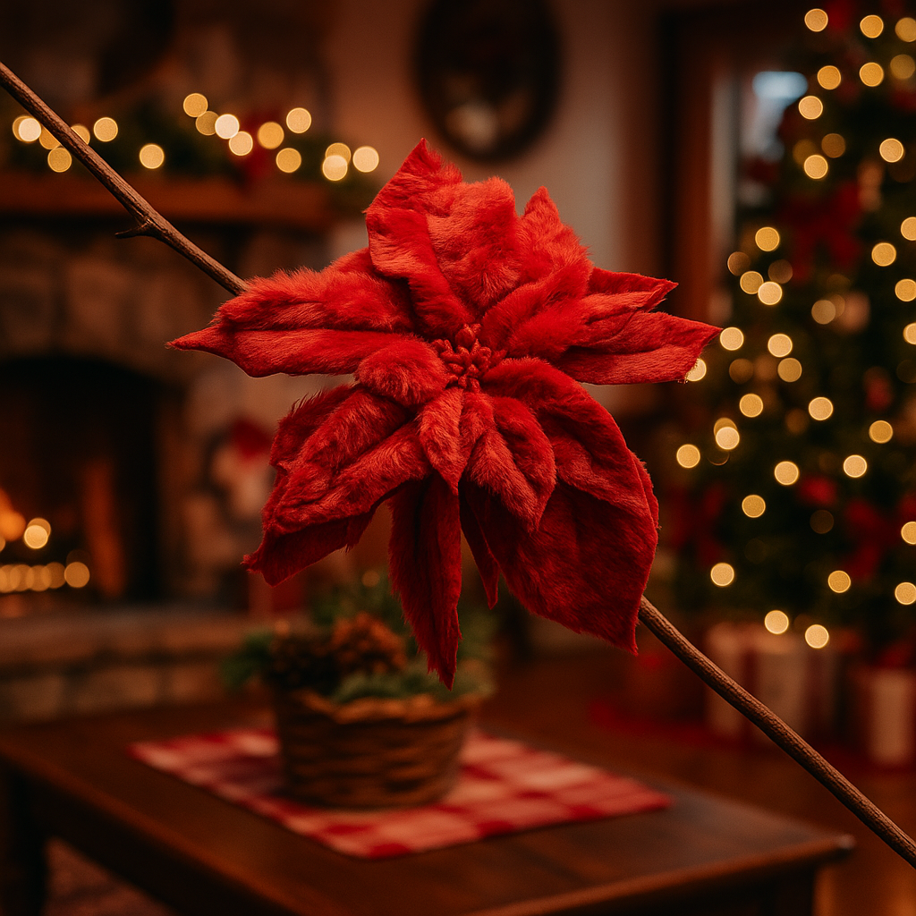 La stella “Furry” è un ricco fiore di poinsettia rivestito da un morbido velluto peluche che cattura la luce e rende ogni ambiente immediatamente più caldo e raffinato.