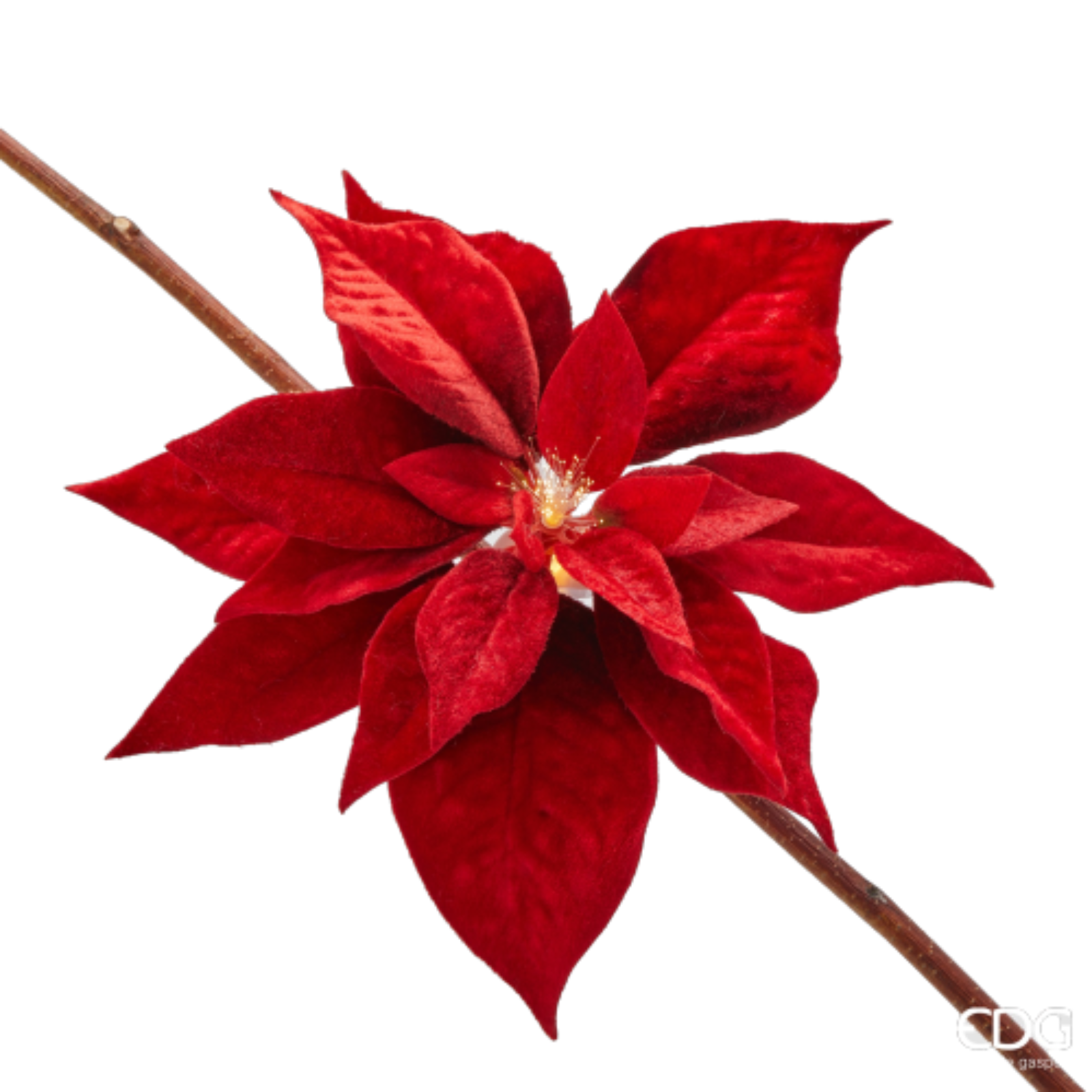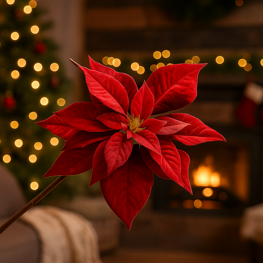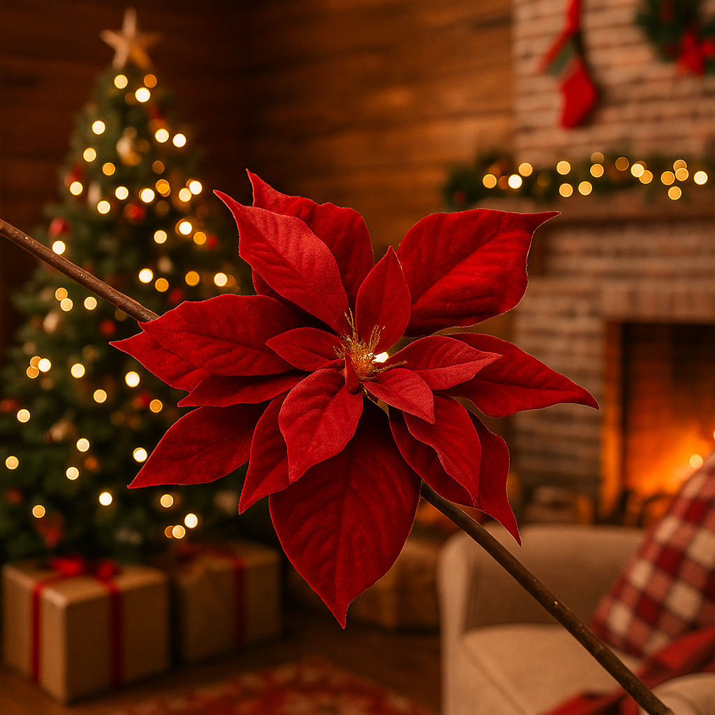 Un fiore di poinsettia morbidissimo al tatto, rivestito di velluto rosso intenso, pensato per dare un tocco di eleganza classica a qualsiasi decorazione natalizia.