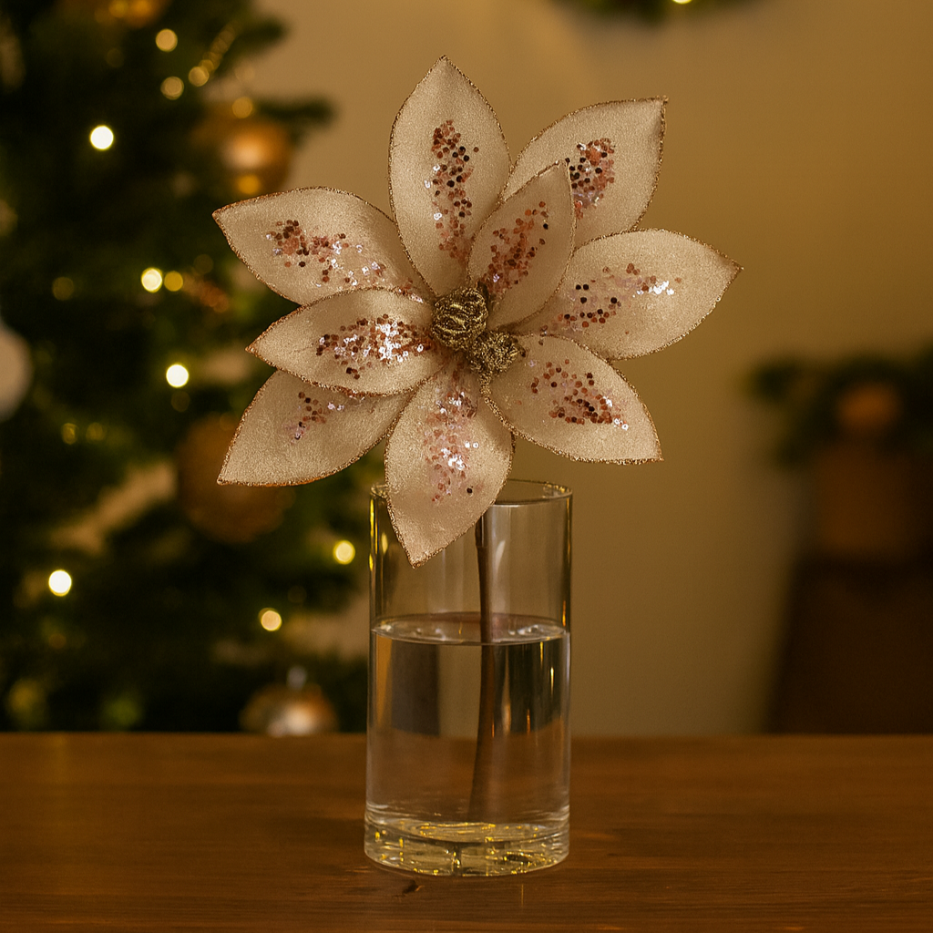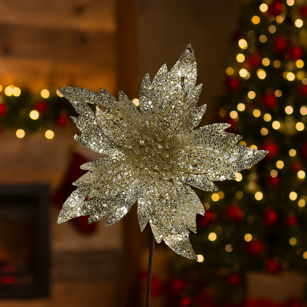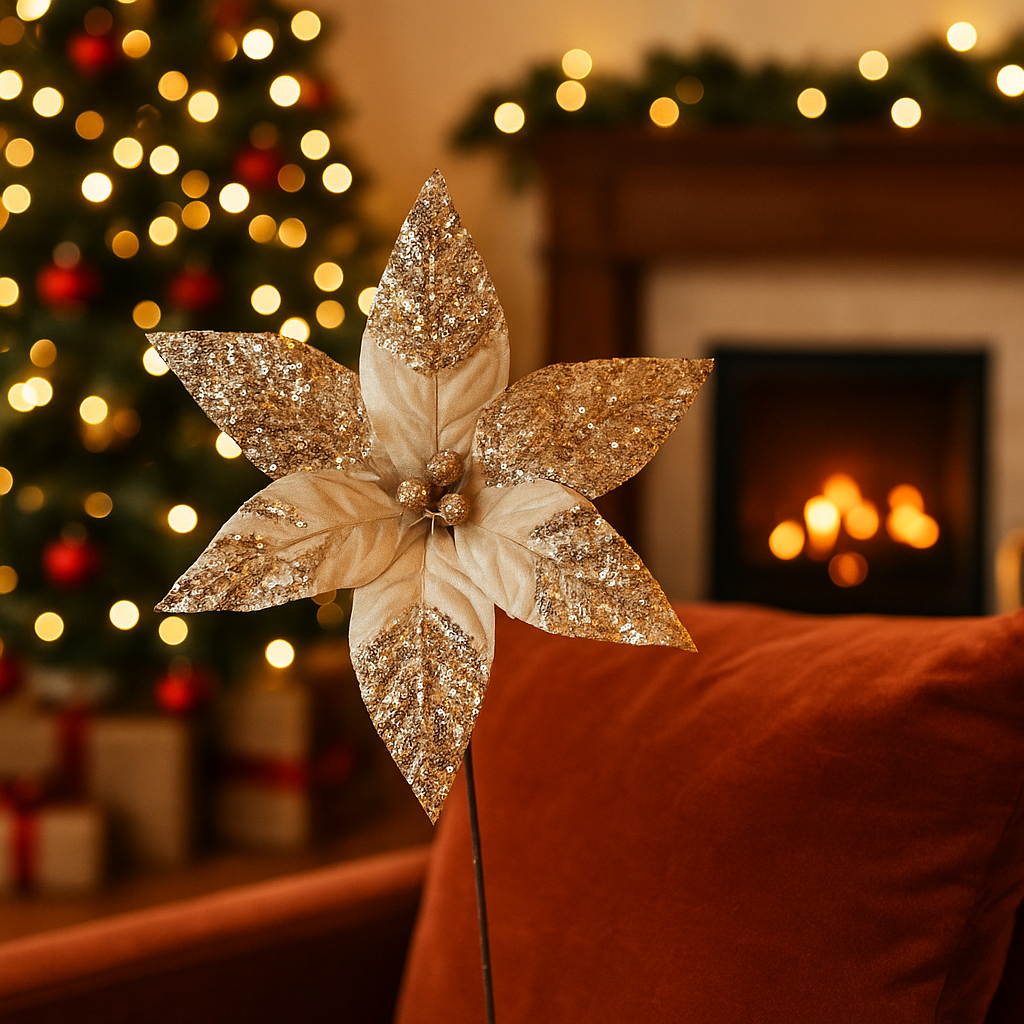 Lo stelo di fiore in paillettes da 40 cm è un raffinato elemento decorativo pensato per aggiungere un tocco di brillante eleganza agli ambienti natalizi.
