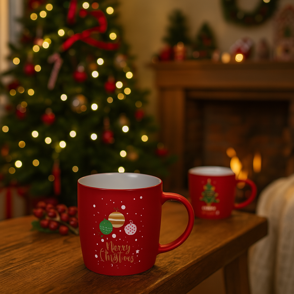 La tazza natalizia grande in porcellana floccata da 390 ml unisce eleganza e calore stagionale grazie alla finitura vellutata che avvolge la superficie esterna, donandole un effetto soffice e raffinato al tatto.