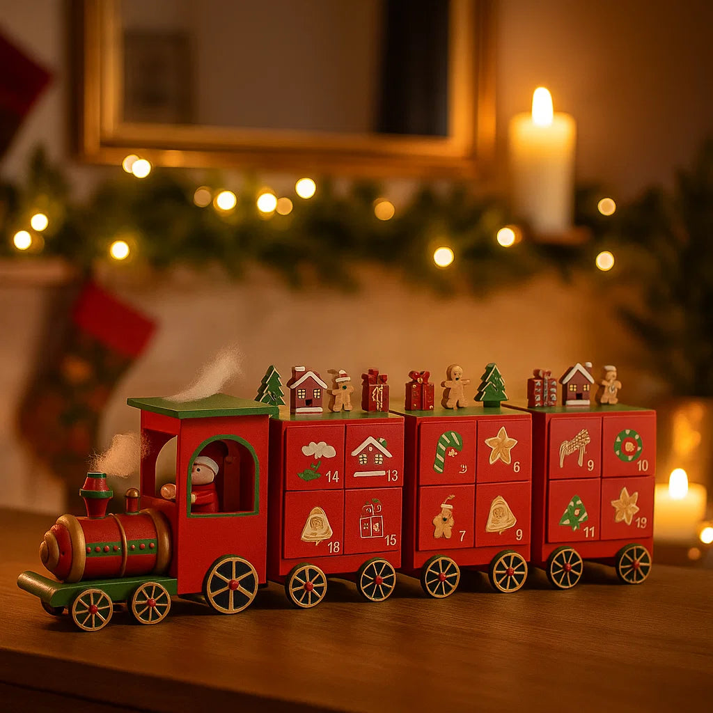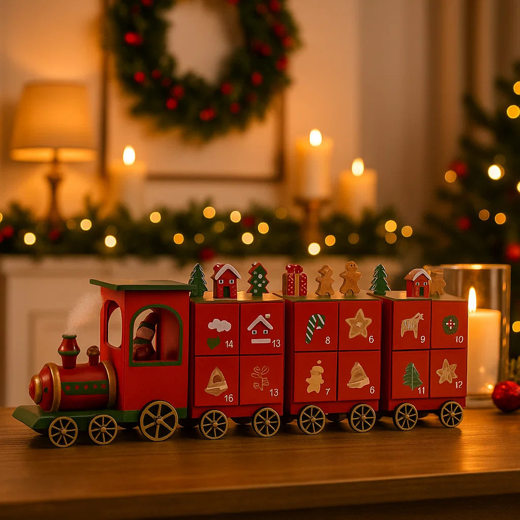 Il trenino decorativo natalizio con tre vagoni in legno è un incantevole ornamento pensato per arricchire le decorazioni delle festività. Realizzato interamente in legno, questo trenino evoca un'atmosfera nostalgica e tradizionale, combinando artigianalità e dettagli raffinati.