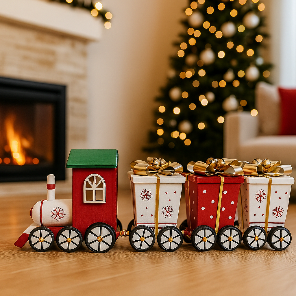 Questo treno natalizio in legno è una decorazione raffinata e al tempo stesso giocosa, lunga 25 cm, pensata per portare nella casa tutta la magia e il calore delle feste.