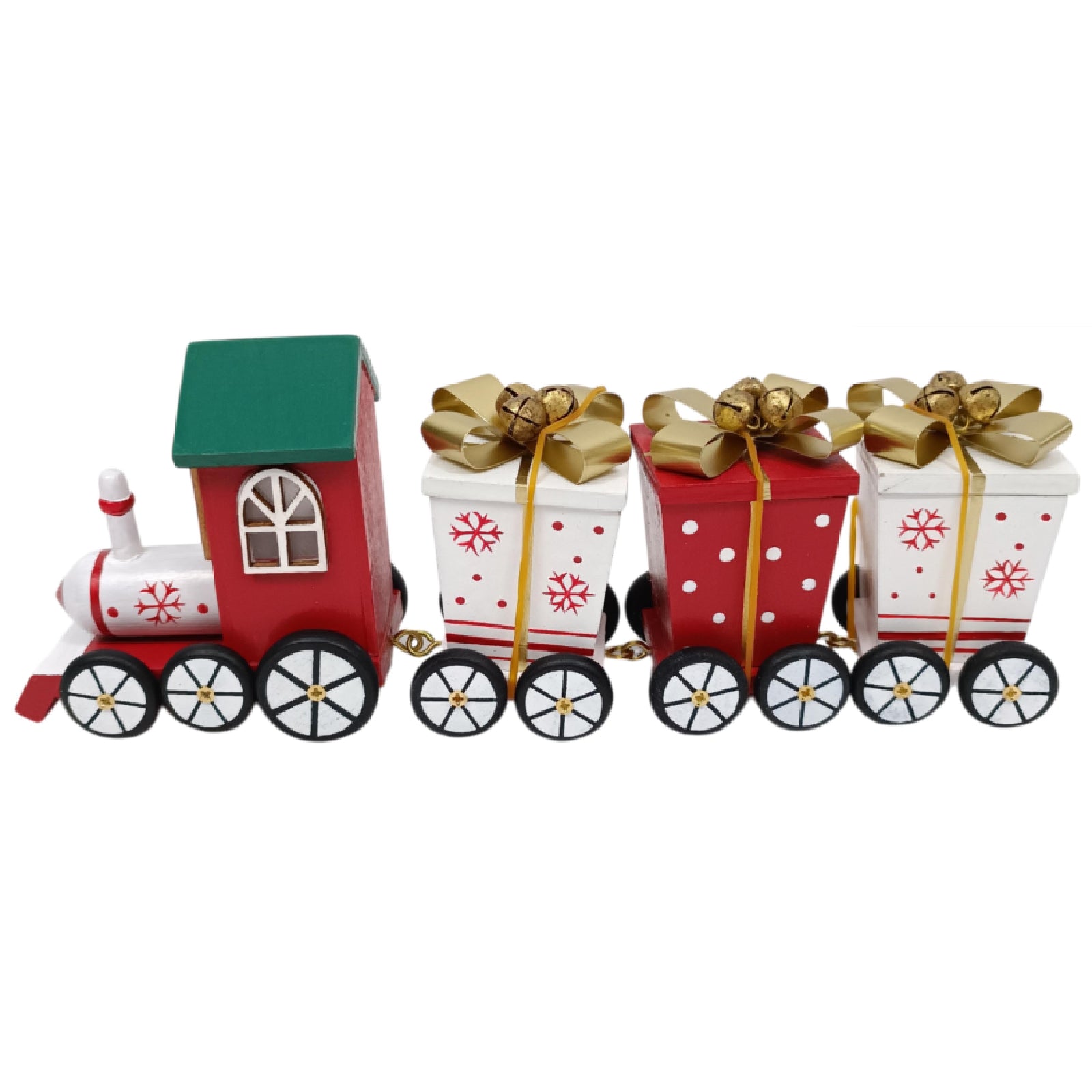 Treno natalizio in legno con pacchi regalo rossi e banchi lungo 25 cm decorazione
