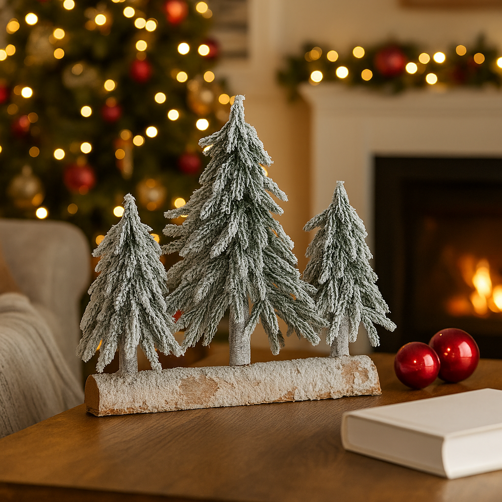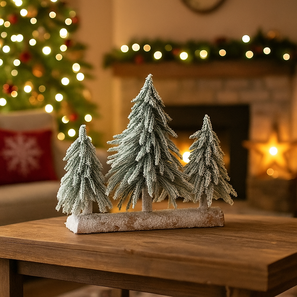 Composizione a tre alberelli su base unica o separata, perfetta per creare un piccolo bosco innevato che aggiunge un tocco di atmosfera nordica e naturale all’allestimento