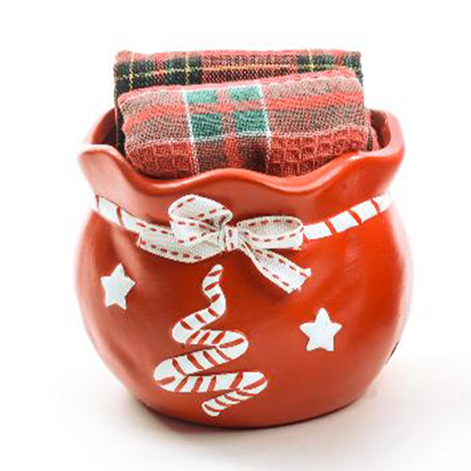 Accostato ai due canovacci in tessuto, realizzati in cotone di ottima qualità e impreziositi da fantasie a contrasto come fiocchi di neve, renne stilizzate o ricami dorati, il set diventa un elemento d’arredo versatile: il vasetto può ospitare piccole piante, una candela profumata o dolcetti fatti in casa, mentre i canovacci proteggono il piano di lavoro o abbelliscono il servizio durante un pranzo o una cena natalizia.