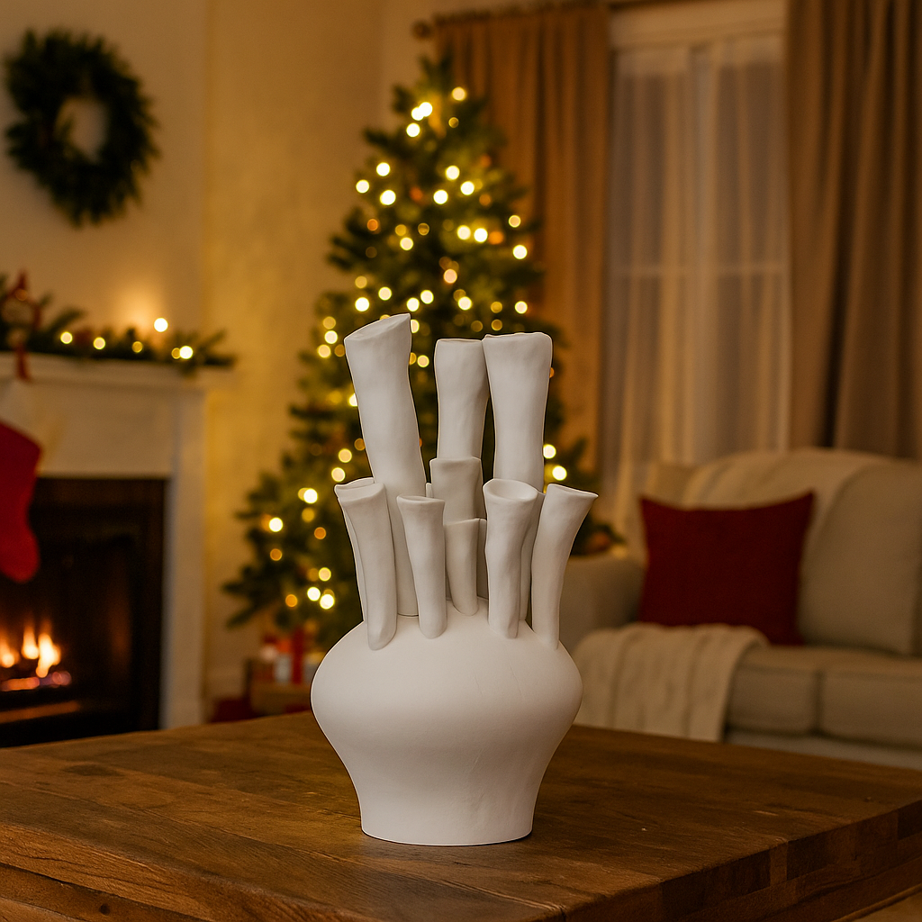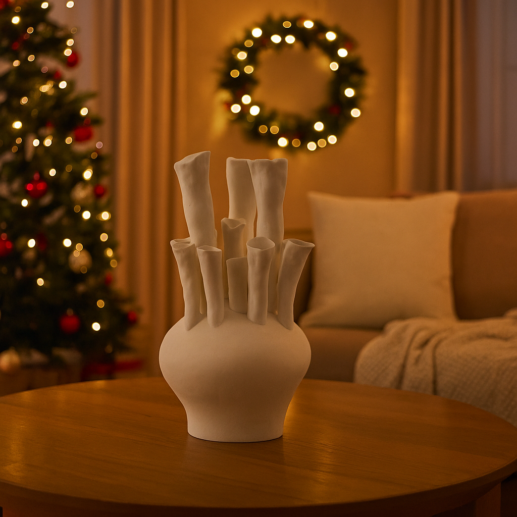 Porta nella tua casa un tocco di design contemporaneo e stile natalizio minimal con il vaso decorativo “Tubes”, caratterizzato da una forma scultorea composta da eleganti tubi verticali. La finitura bianca opaca, pulita e luminosa, lo rende un complemento d’arredo perfetto per ambienti moderni o nordici, ma anche per composizioni natalizie sobrie ed eleganti. Alto 46 cm, è ideale da usare come base per rami decorativi, fiori artificiali, luci o elementi naturali, trasformandosi in un punto focale raffinato per soggiorni, ingressi o tavoli da esposizione.