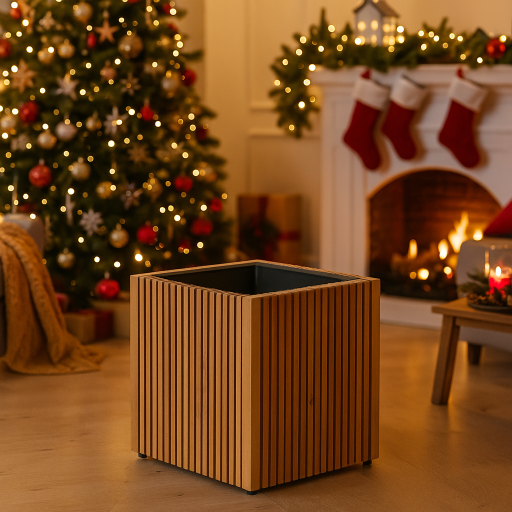 Elegante e naturale, questo vaso quadrato realizzato con listelli di legno marrone aggiunge calore materico a qualsiasi ambiente, dal salotto all’ingresso, fino a vetrine e allestimenti stagionali. L’altezza di 50 cm lo rende perfetto per rami decorativi, fiori artificiali, pampas o piante in vaso (inserite con coprivasi interno).