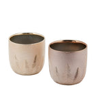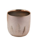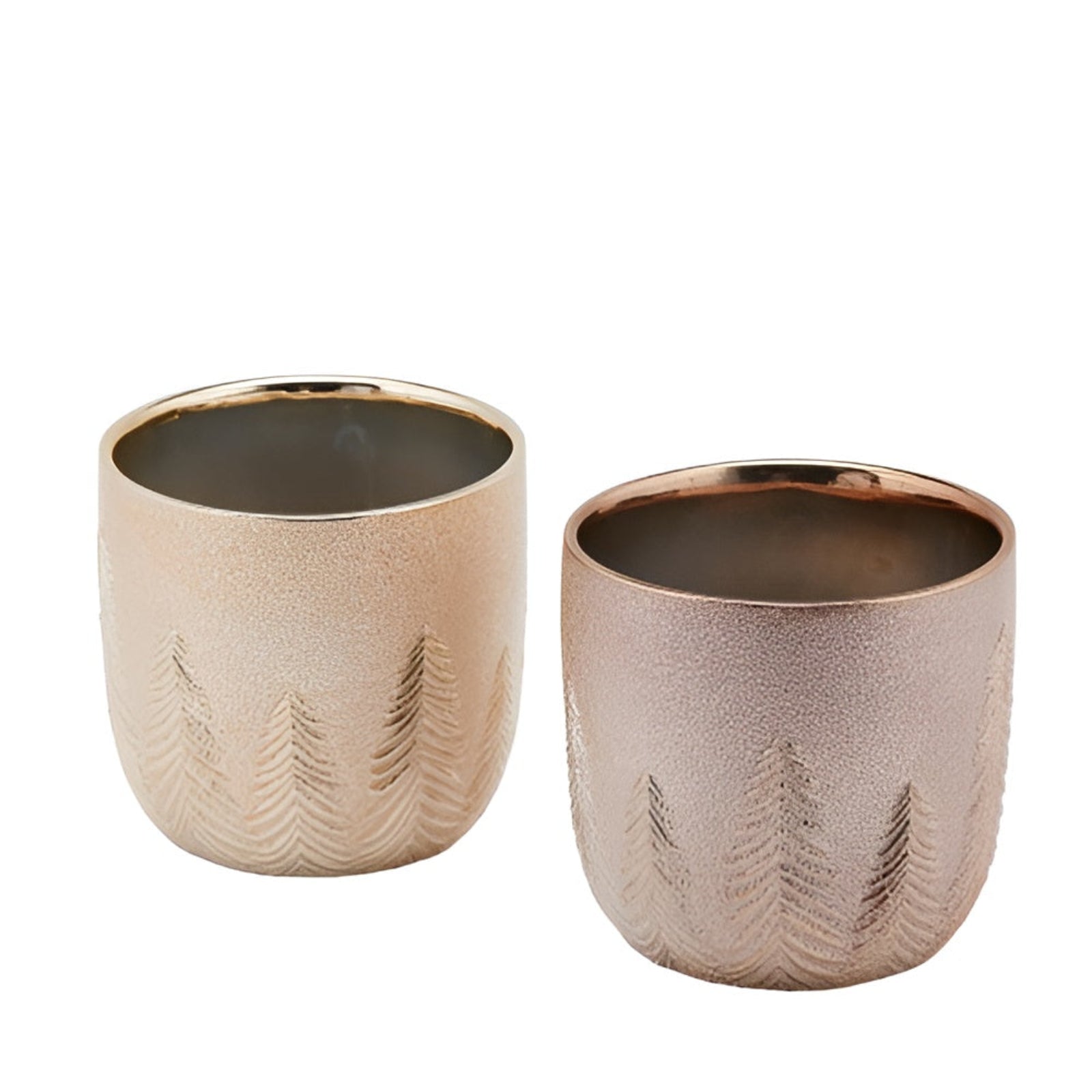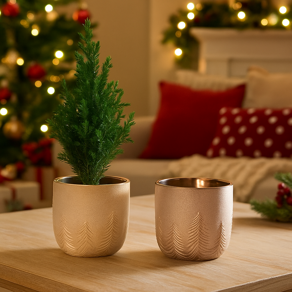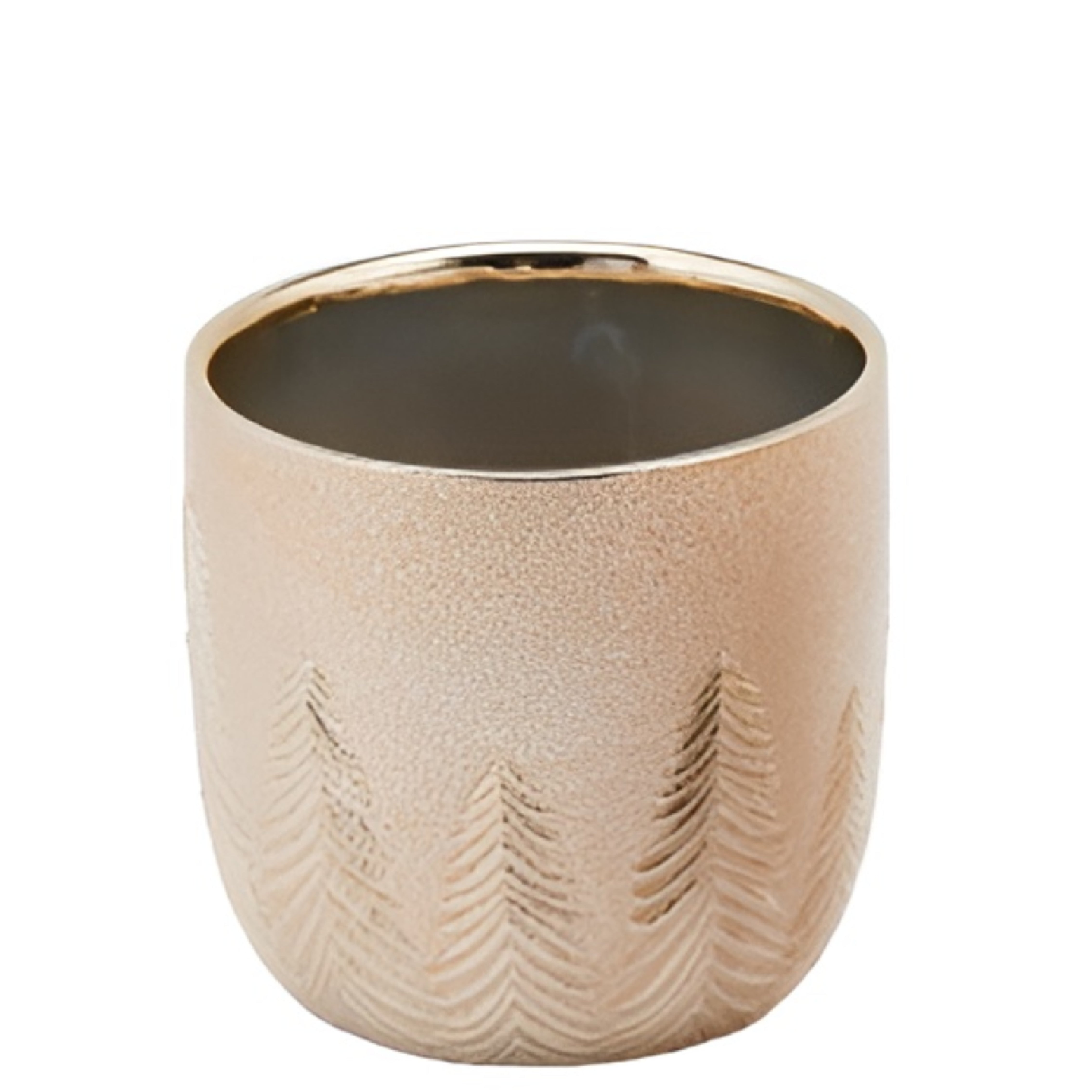 Un contenitore compatto e decorativo che porta subito l’atmosfera delle feste: il bianco (o tono neutro) del corpo esalta il motivo dei pini dorati, creando un contrasto elegante e luminoso. Perfetto come cachepot per piccole piante, per lucine a batteria, pot‑pourri o come mini centrotavola su tavoli, mensole e consolle.