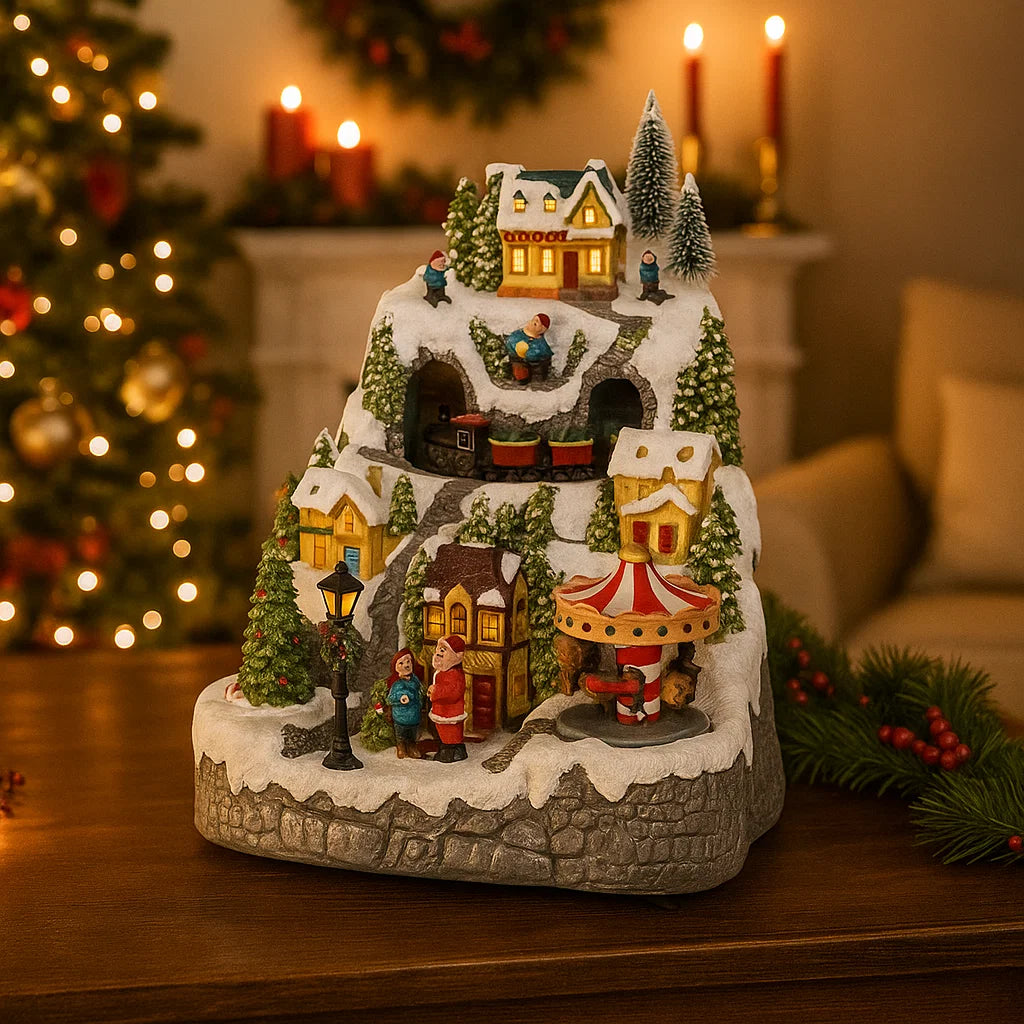 Al centro della scena, un trenino si muove entrando e uscendo da una galleria, mentre alla base troviamo un albero di Natale e una giostrina che ruotano su se stessi, creando un affascinante effetto dinamico.