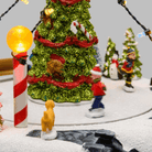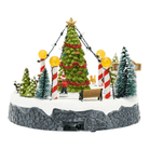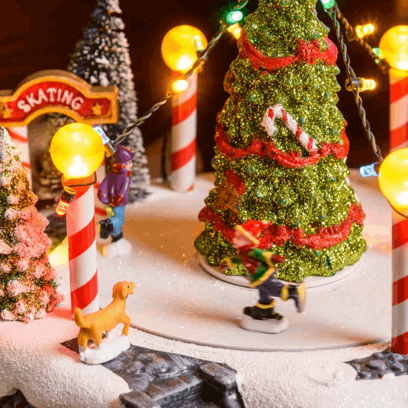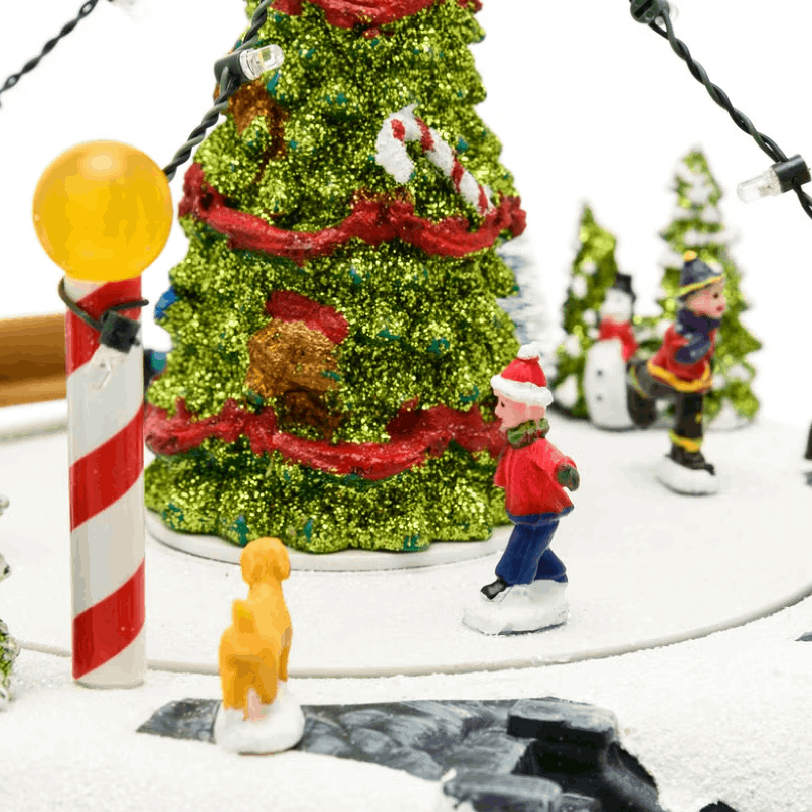 Villaggio di Natale raffigurante un paesaggio innevato con Albero di Natale e pattinatori rotanti in movimento su pista di ghiaccio.