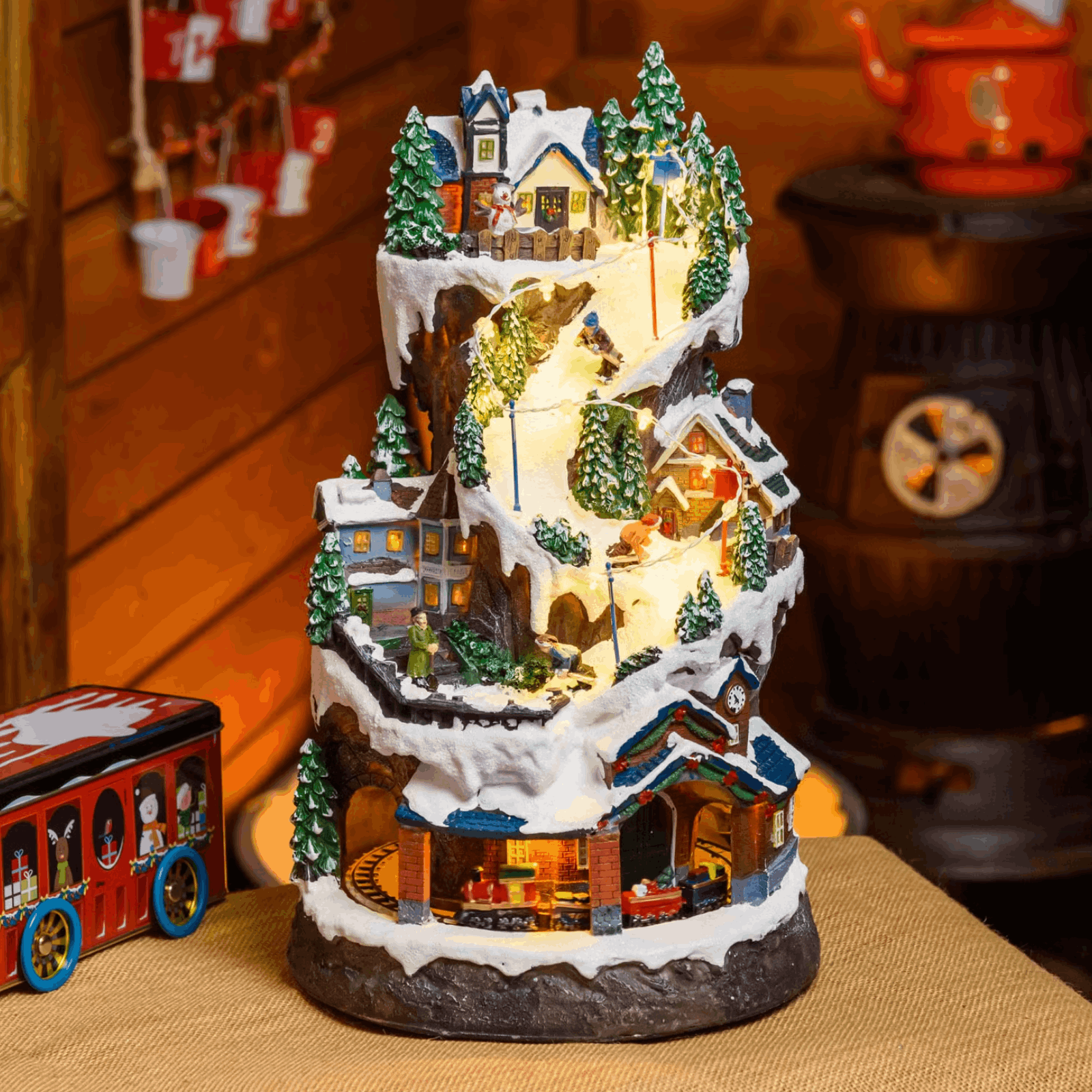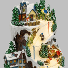 Villaggio Innevato con Sciatori, Trenino in Galleria in movimento in Polyresina, h 38 cm