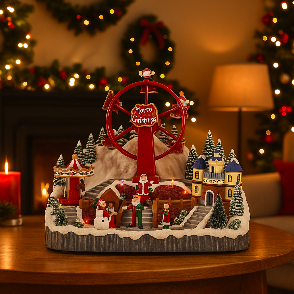 Il villaggio natalizio con giostre e luci LED è una decorazione festiva che incanta con la sua combinazione di eleganza e dinamismo.