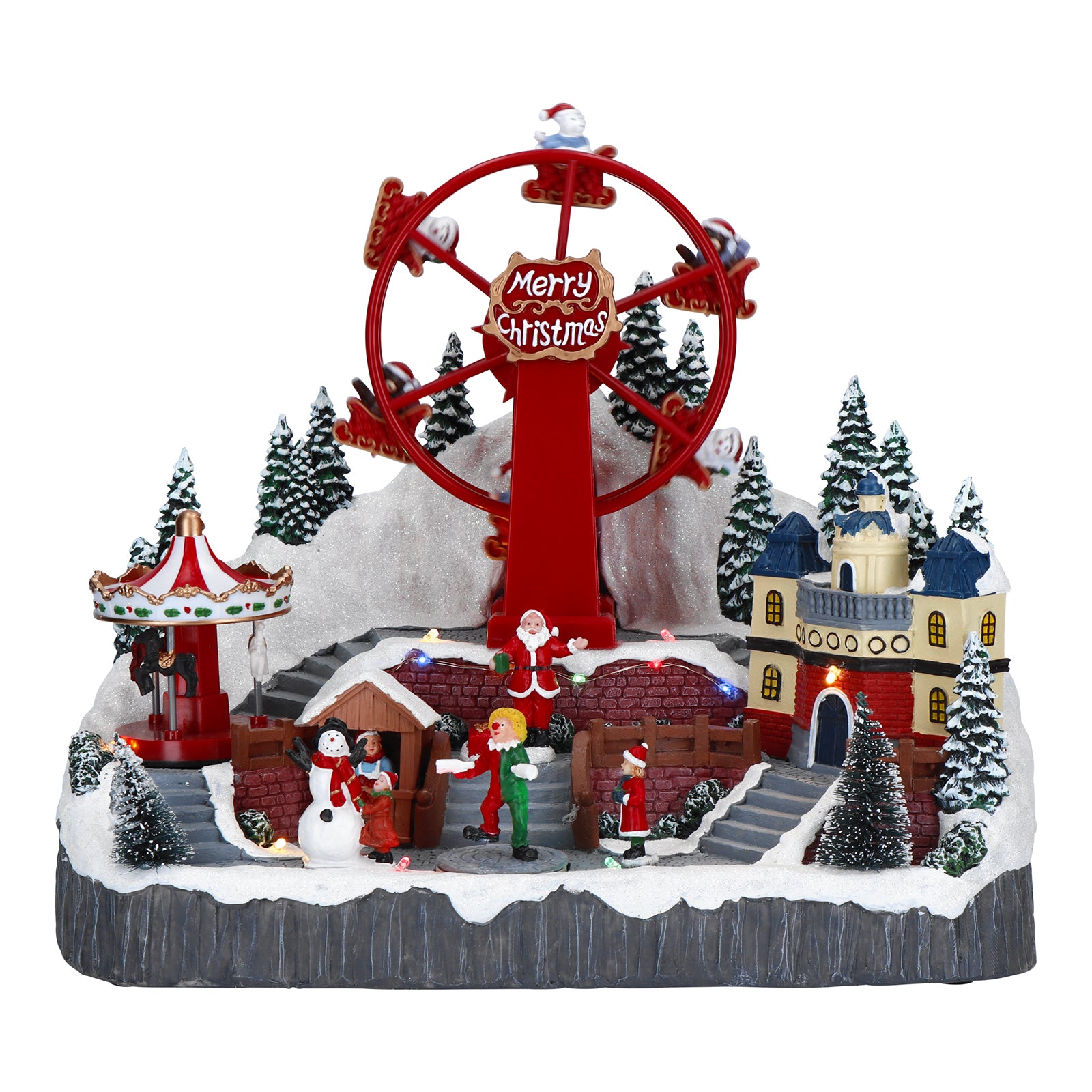 Questa scenografia ricrea un affascinante villaggio natalizio in miniatura, completo di dettagli vivaci e una giostra animata, il tutto illuminato da luci LED che aggiungono un tocco di magia e calore.